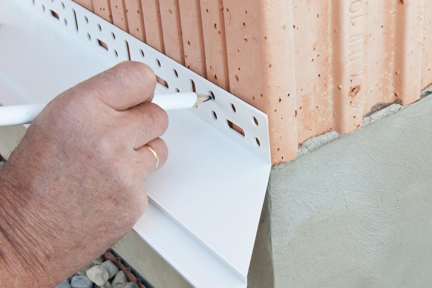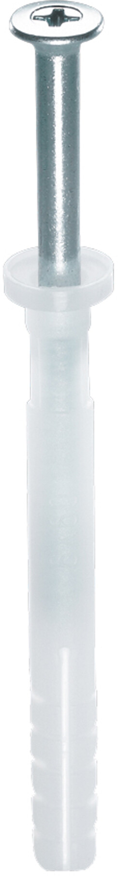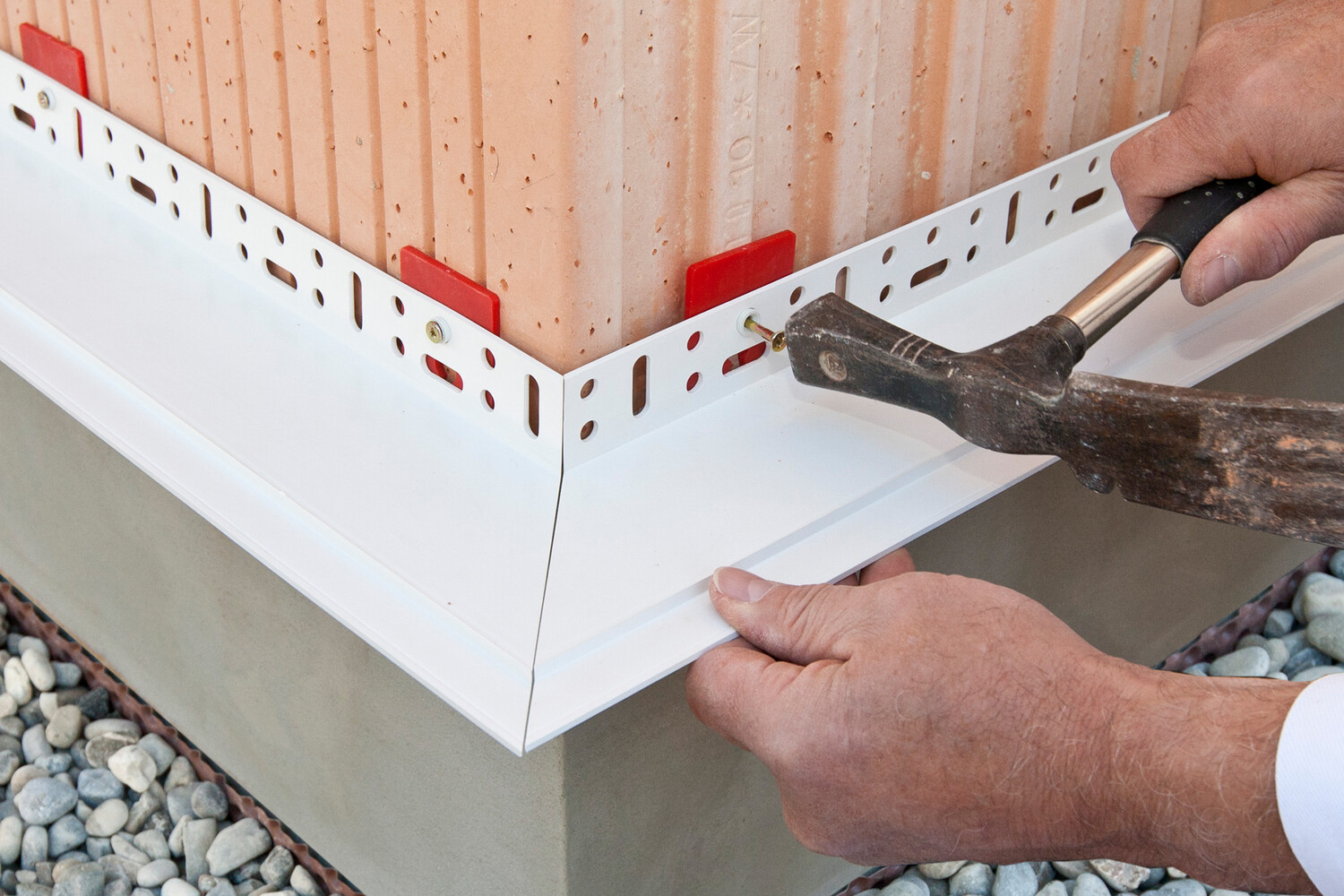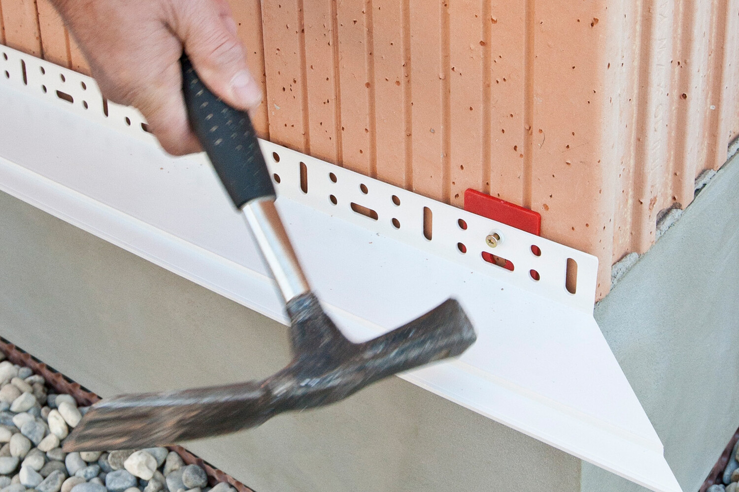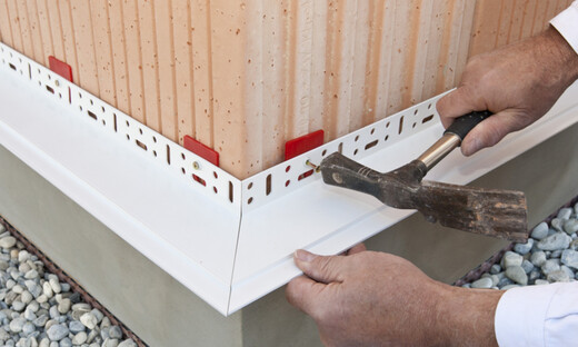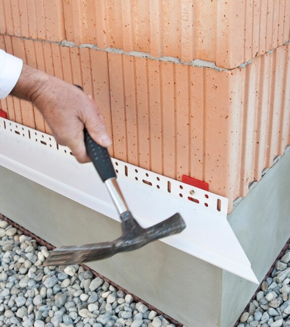 Die Nageldübel von Baumit haben einen kleinen Kragen, mit dem ein Durchrutschen durch das Setzloch am Anschraubsteg des Sockelprofils verhindert wird. Stecke den Nageldübel durch den Anschraubsteg in das vorbereitete Bohrloch und schlage den Nagel ein.