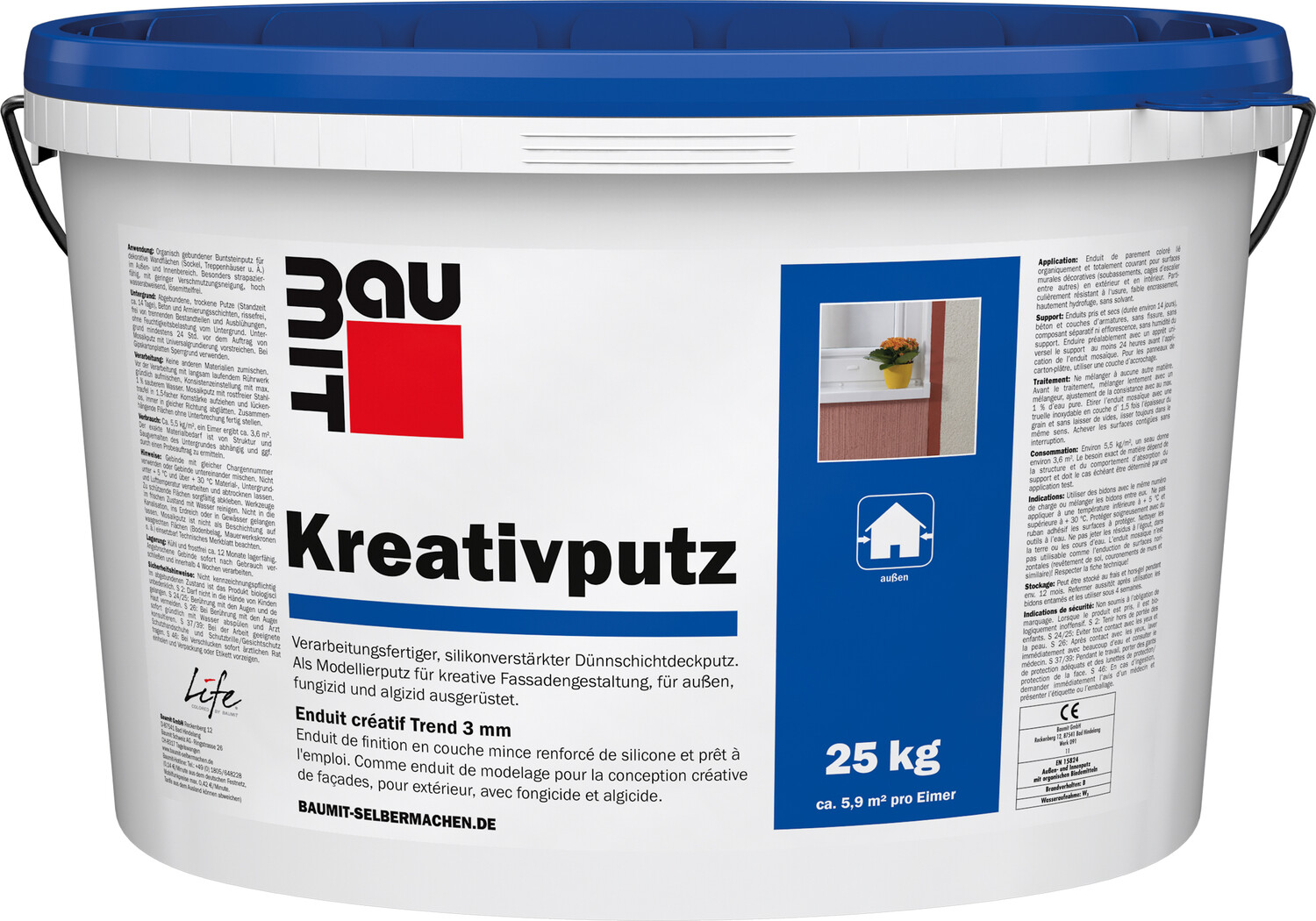 Verarbeitungsfertiger, silikonverstärkter Strukturputz in verschiedenen Körnungen, von sehr fein bis grob für den Außenbereich auf mineralische Putze und andere zementgebundene Baustoffe. Weiß und vielen Farbtönen lieferbar