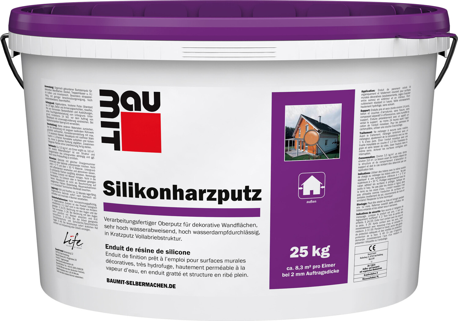 Verarbeitungsfertiger Strukturputz / Dekorputz / Edelputz auf Basis von Silikonharzen für außen an Wänden und am Sockel. Für langlebige schöne Fassaden mit hoher Schmutzabweisung (Lotuseffekt). Als Reibeputz / Rillenputz 2 mm, 3 mm oder Kratzstruktur 1,5 mm, 2 mm, 3 mm.