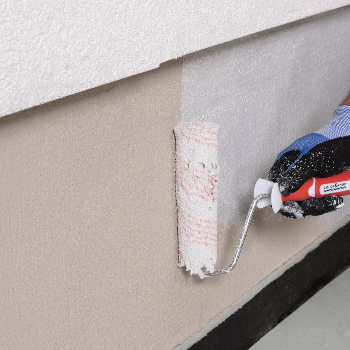 Auf neuwertigen Kalk-, Kalkzement- oder Zementputzen sowie Spachteln wird die Baumit Universalgrundierung in Weiß aufgetragen.