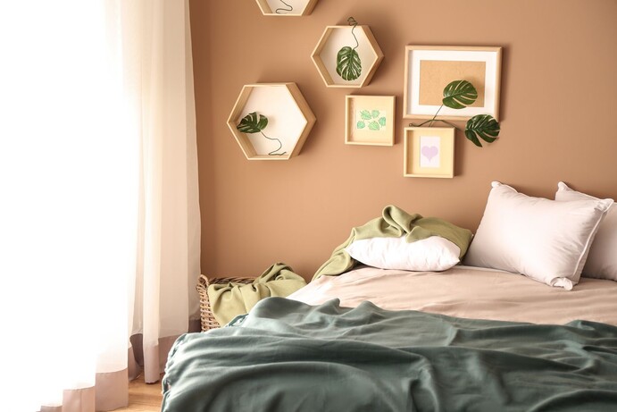 Avec des couleurs pastel claires et douces, tu peux faire en sorte qu'une petite pièce paraisse visuellement plus grande. Des couleurs riches et vives peuvent souligner ton mur et mettre en valeur les objets d'ameublement.