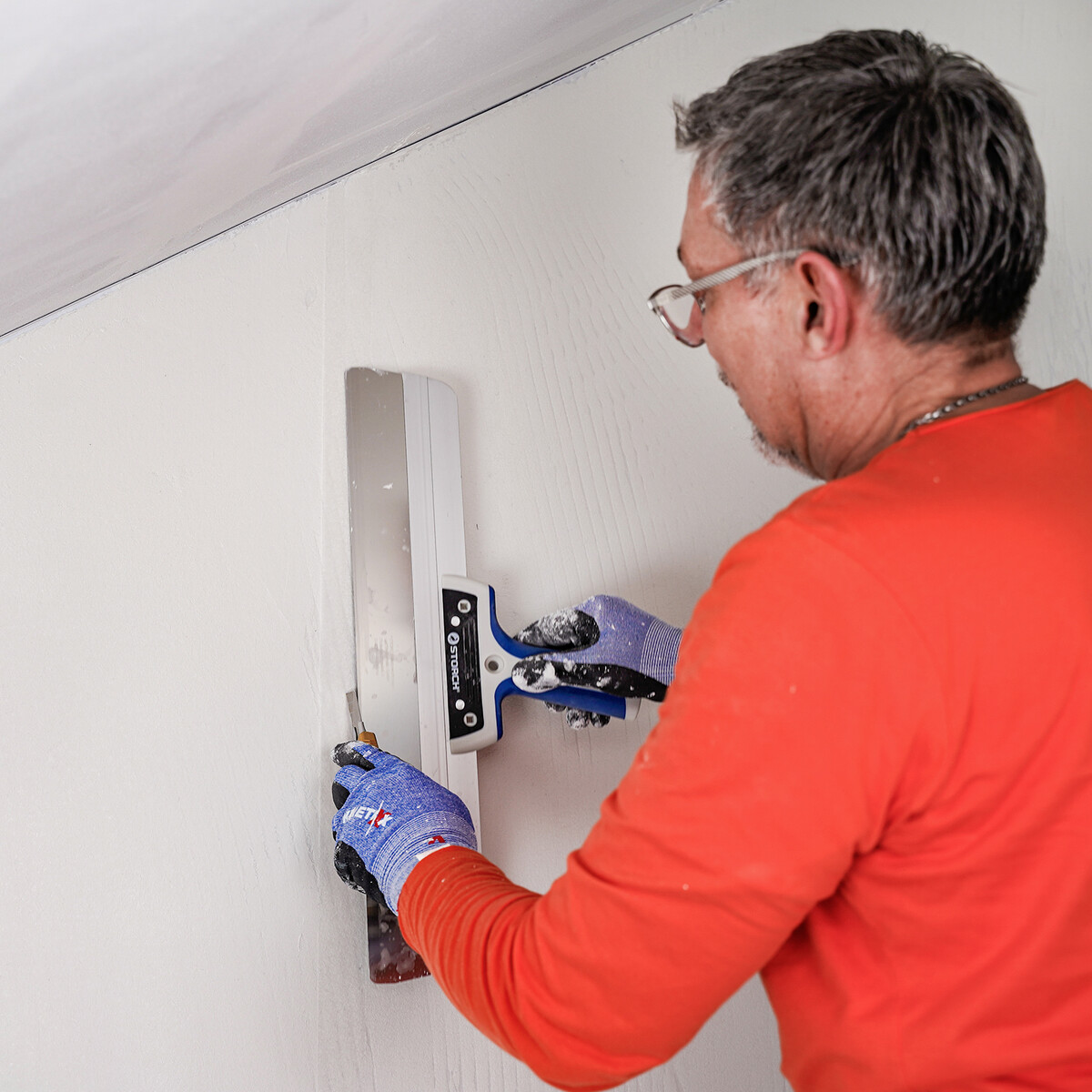 Pour le raclage sur des surfaces plus grandes, un couteau à enduire, par exemple le Storch Flexogrip, convient.