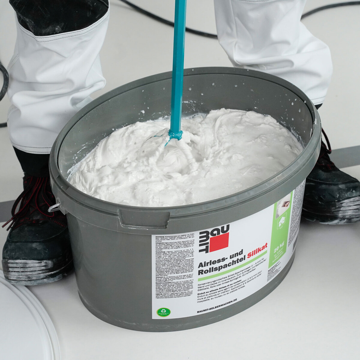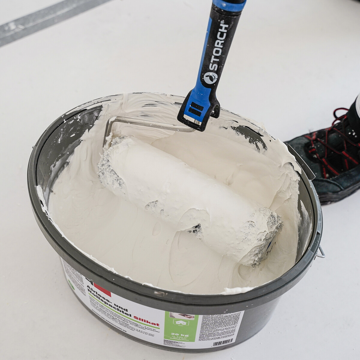 L'enduit au silicate en rouleau est prêt à l'emploi dans un seau. Comme les enduits minéraux ont tendance à sédimenter naturellement, tu dois bien mélanger le contenu avec un malaxeur électrique et un bâton mélangeur adapté (par ex. Collomix KR).