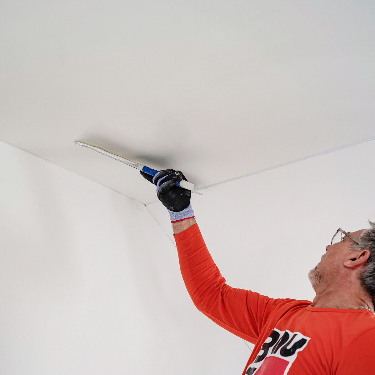 Après au moins 48 heures de séchage, tu peux appliquer la couche de finition. Commence par mastiquer les bords et les raccords.