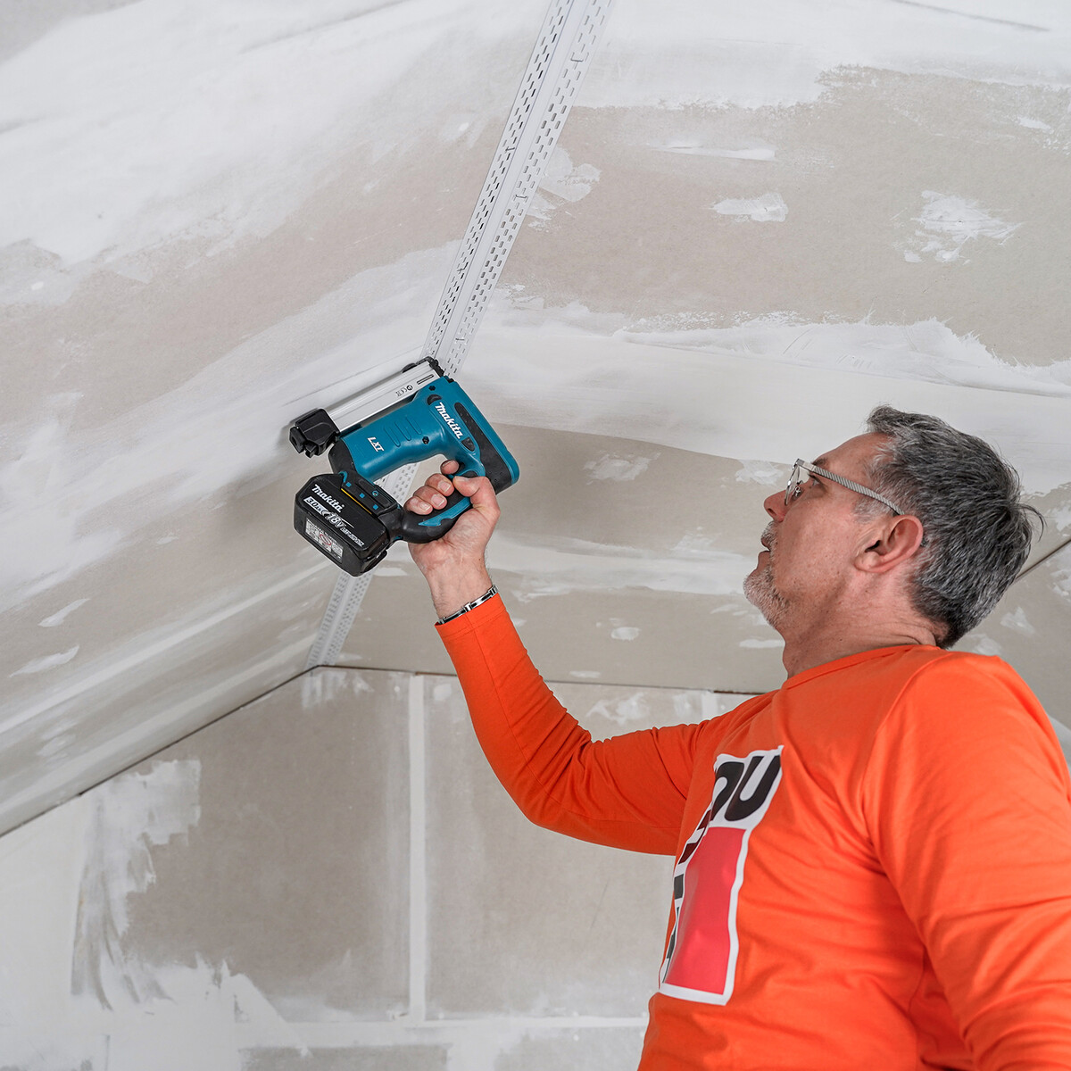 Aligne maintenant le profilé de joint de dilatation le long du rayon laser et fixe le premier côté à la plaque de cloison sèche à l'aide d'une agrafeuse.