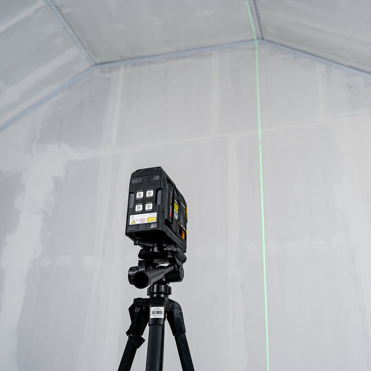 Place maintenant le laser croisé sur un trépied et aligne le faisceau laser sur les deux repères précédemment placés. Tu obtiendras ainsi une ligne de fuite exacte sur laquelle tu pourras aligner le profil plus tard.