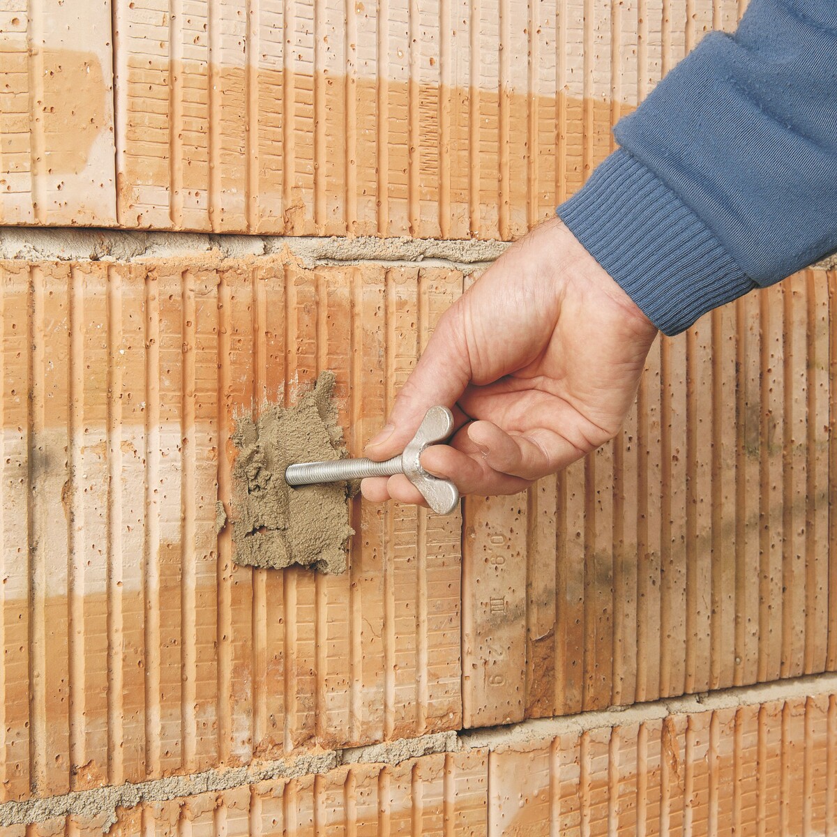 Ensuite, enfoncer l'élément à fixer (ancrage, chevilles, etc.) dans le mortier frais et l'aligner. Comme le Ciment à prise rapide Baumit durcit au bout de 3 à 5 minutes seulement, les étapes de travail doivent être effectuées rapidement les unes après les autres.