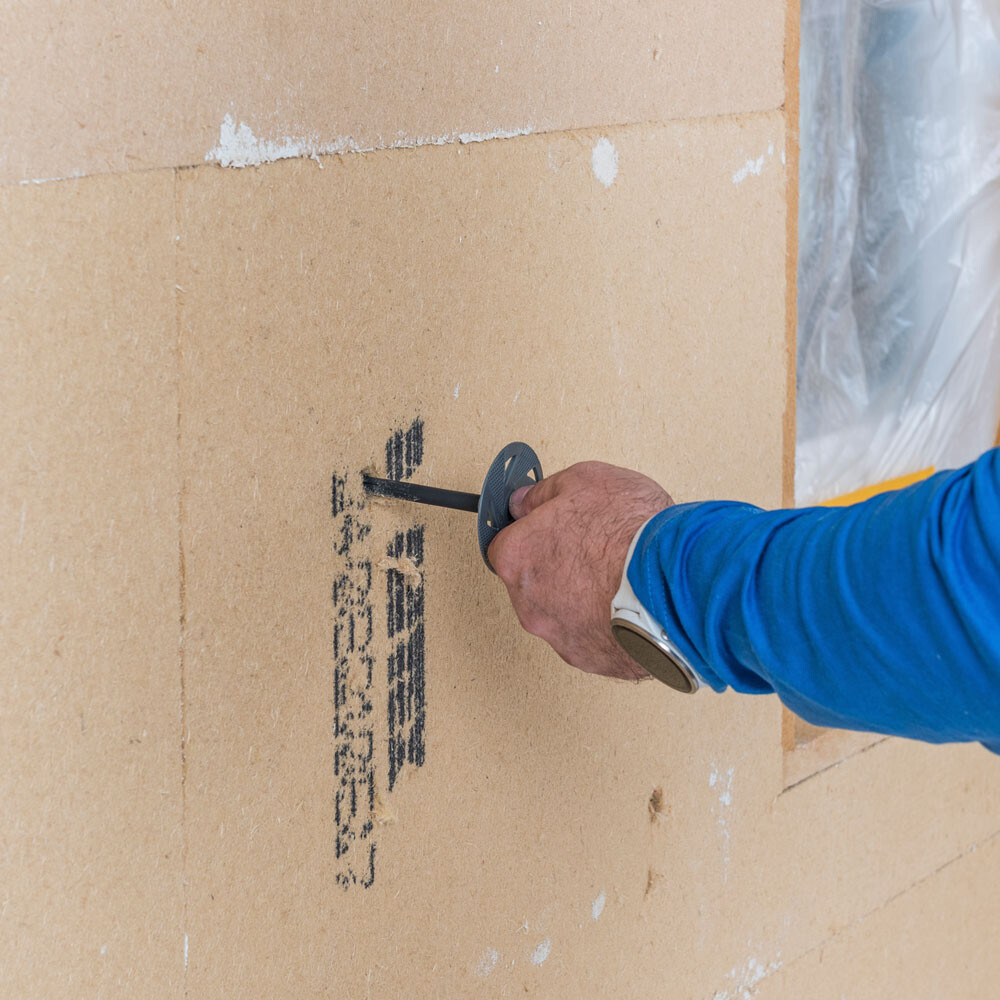 Utilise un foret adapté au support. Perce le trou de cheville dans le support à l'endroit marqué, à travers la plaque d'isolation collée. Les panneaux isolants doivent sécher au moins 2 jours après le collage avant que tu ne puisses percer les trous pour les chevilles.