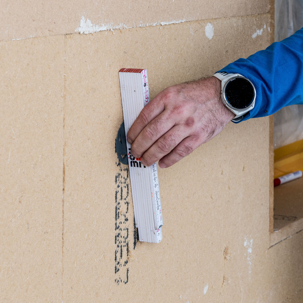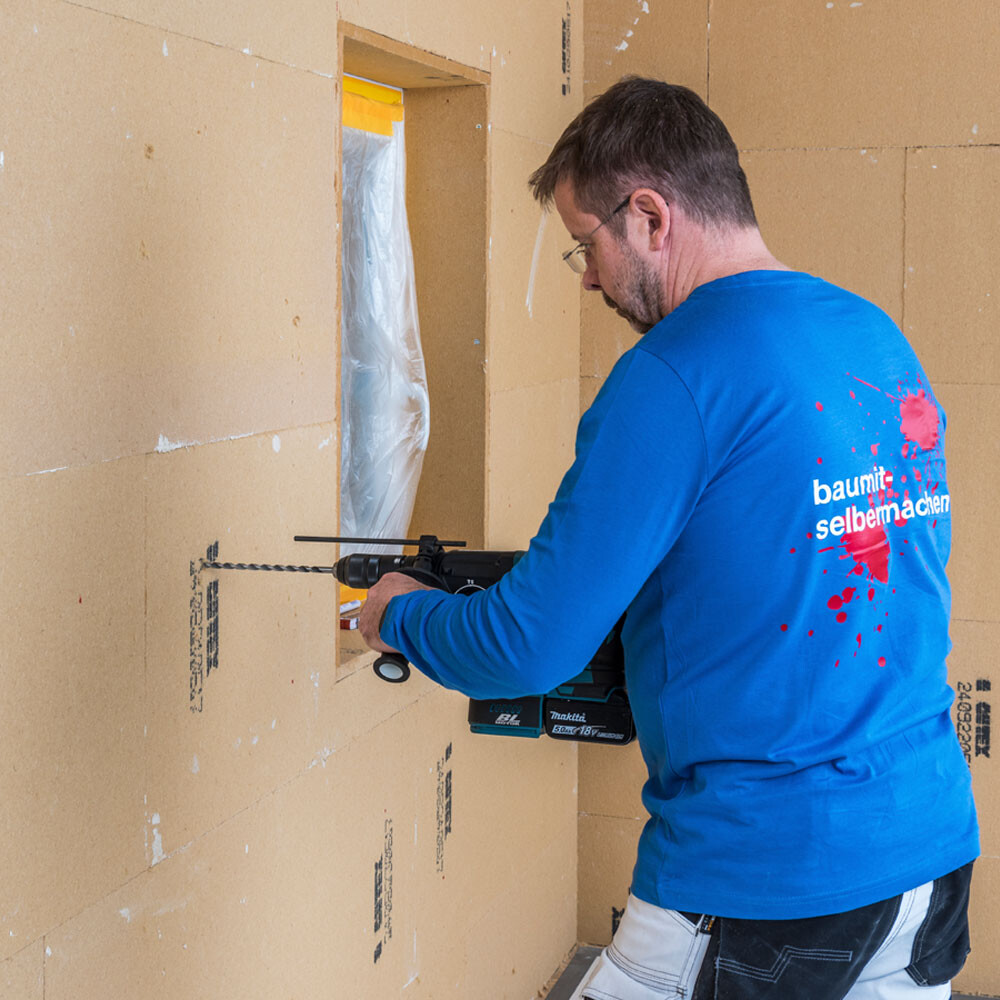 Le trou de perçage dans le béton, la brique pleine ou la brique creuse et perforée doit avoir une profondeur minimale de 40 mm, et dans le béton cellulaire de 60 mm. À cette profondeur minimale, il faut ajouter l'épaisseur de l'ancien enduit (env. 20 mm), l'épaisseur de la couche de colle (env. 10 mm) et l'épaisseur des panneaux. Règle la butée de profondeur de la perceuse en conséquence.