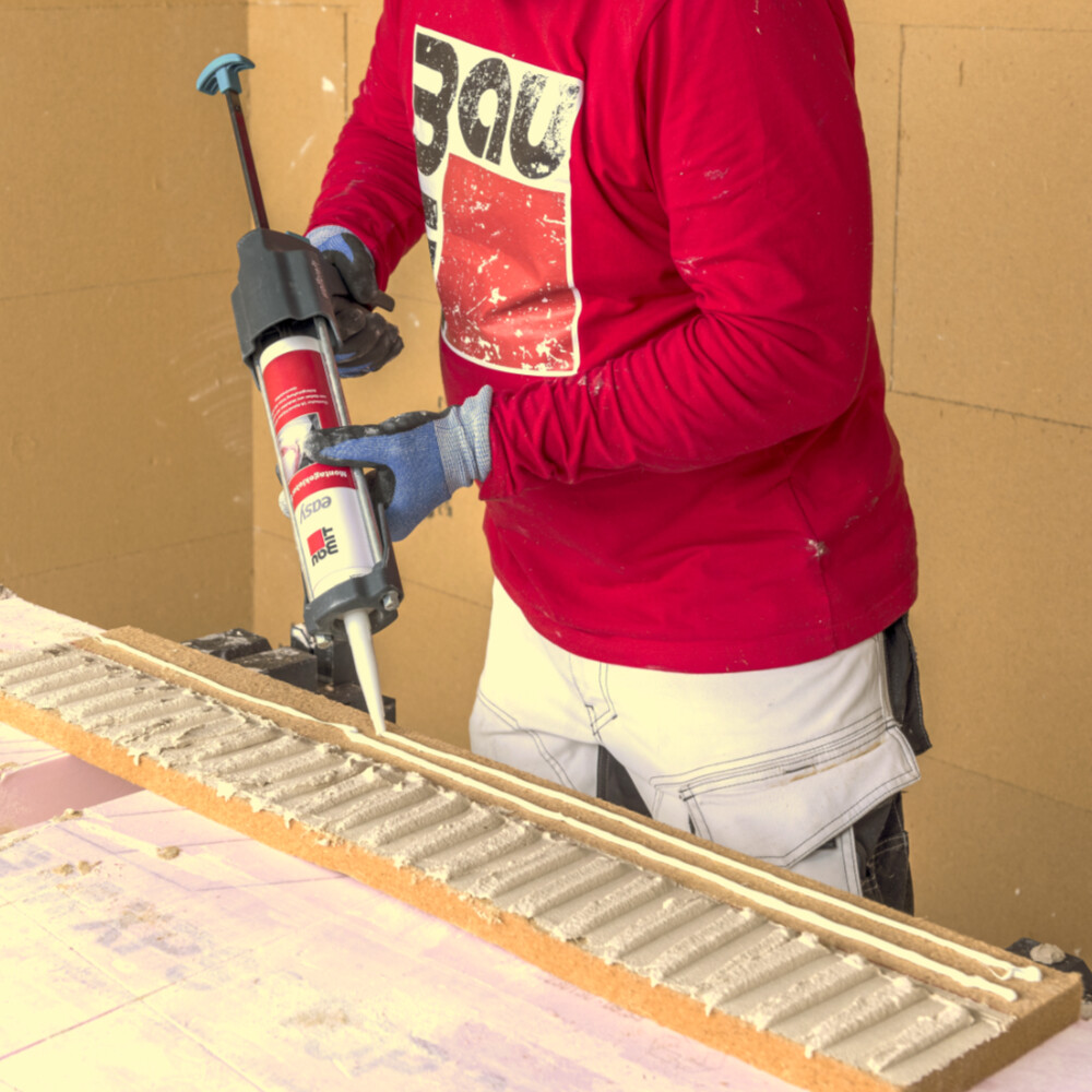 Commence par appliquer le mortier colle en une couche fine et sous pression sur les surfaces concernées. Cette technique d'application sous pression permet de mieux lier les fibres et d'améliorer l'adhérence de la colle sur le panneau.