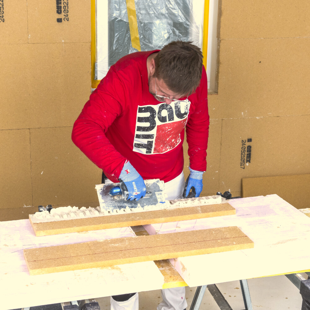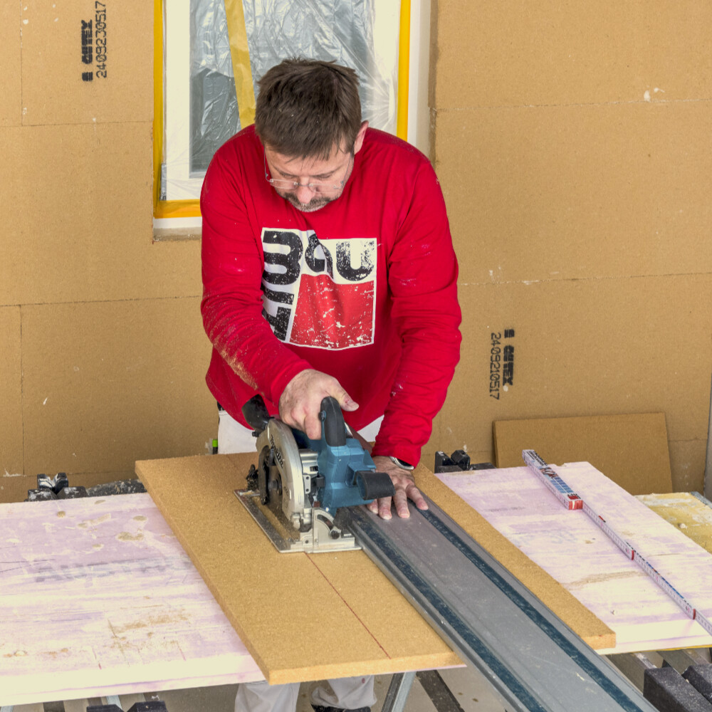 Pour garantir un montage sans joints du panneau d'embrasure, il est essentiel de réaliser des coupes droites et précises. Nous te recommandons donc d'utiliser un rail de guidage pour ta scie circulaire, en particulier pour les coupes plus longues.