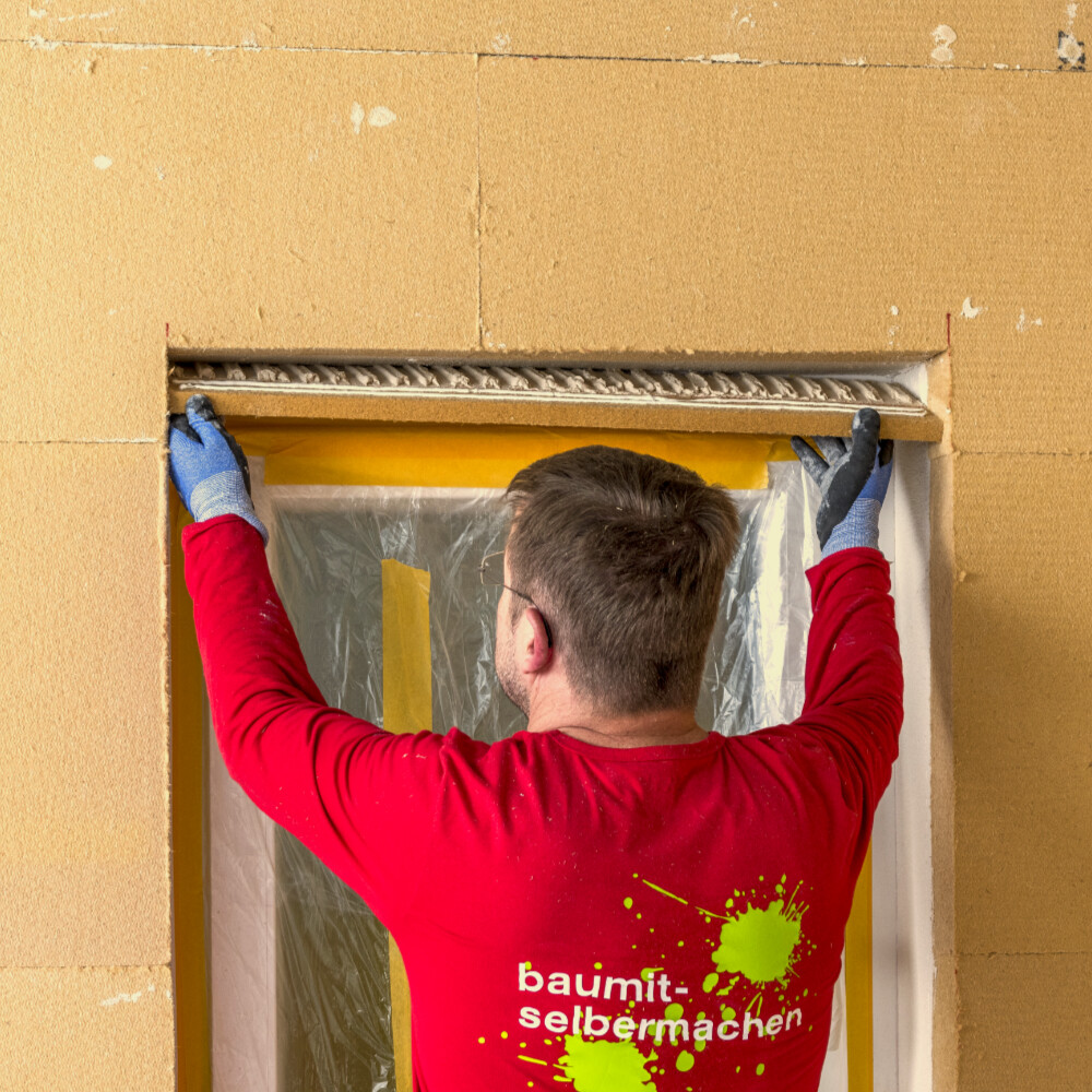 Commence par balayer soigneusement la surface de collage avant d'appliquer la colle, afin d'éliminer la poussière et la sciure de bois. La jonction entre le panneau d'embrasure et le panneau isolant mural doit rester exempte de mortier-colle. Marque cette zone et applique ensuite le mortier-colle fraîchement mélangé uniquement dans la zone qui sera ensuite collée sur la maçonnerie ou l'enduit.