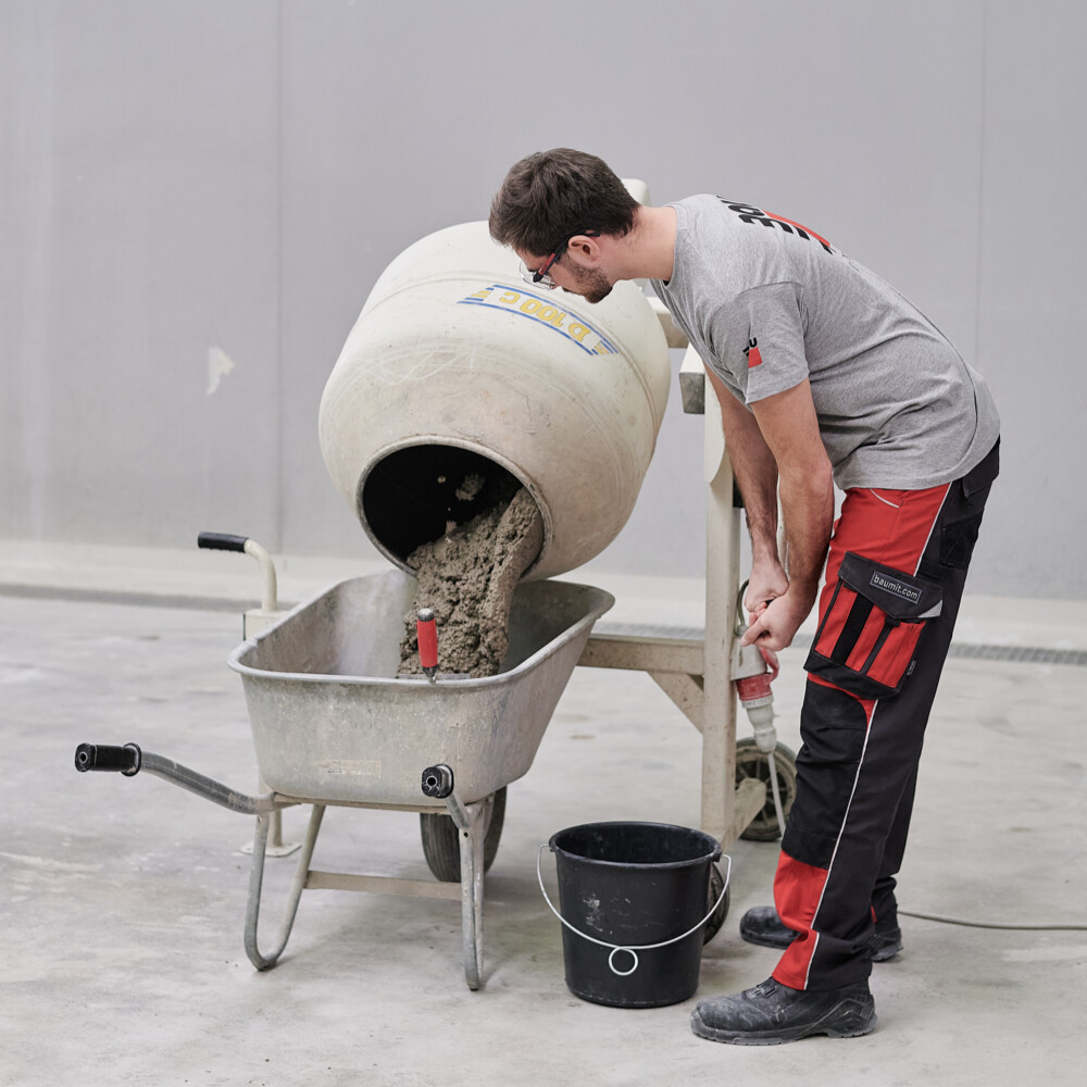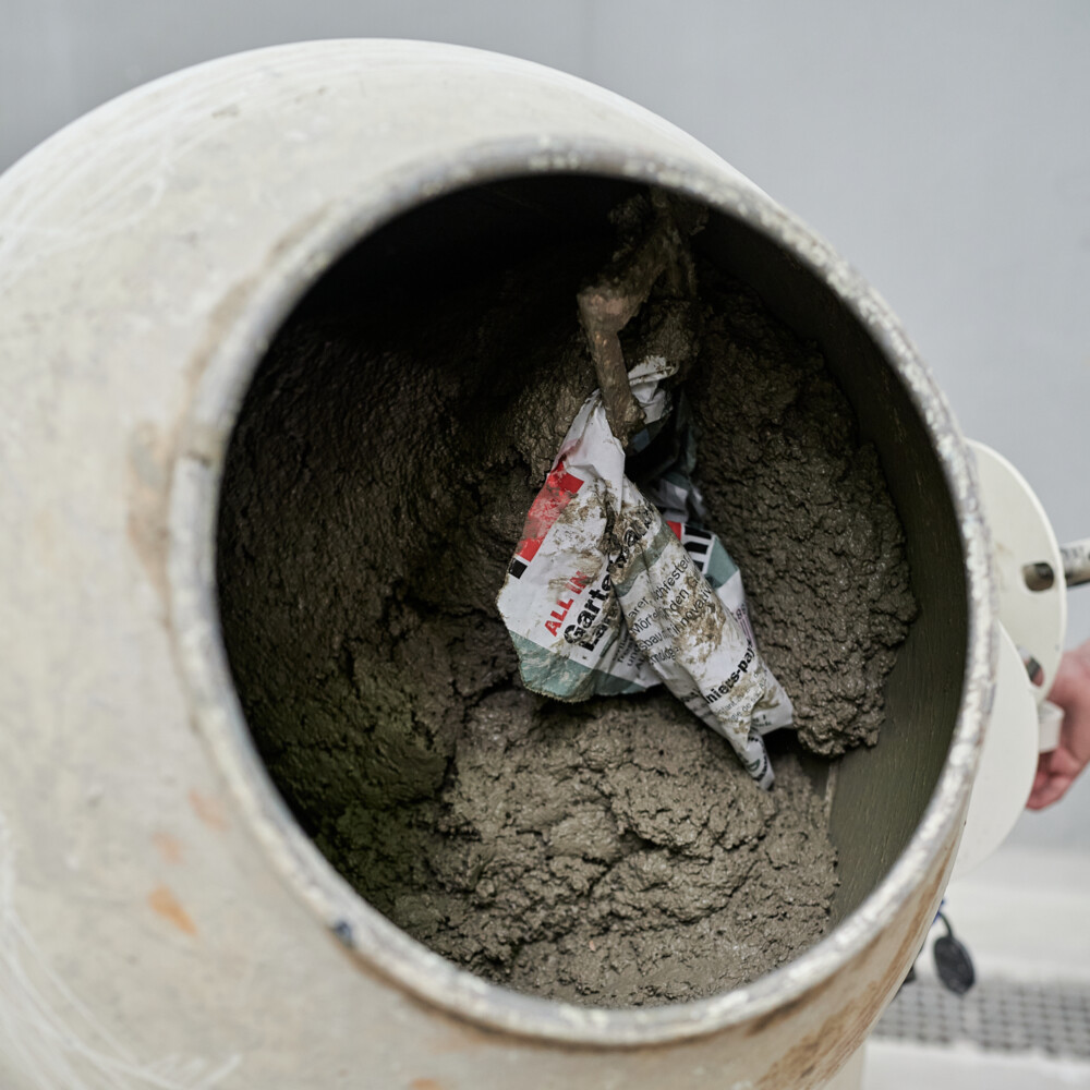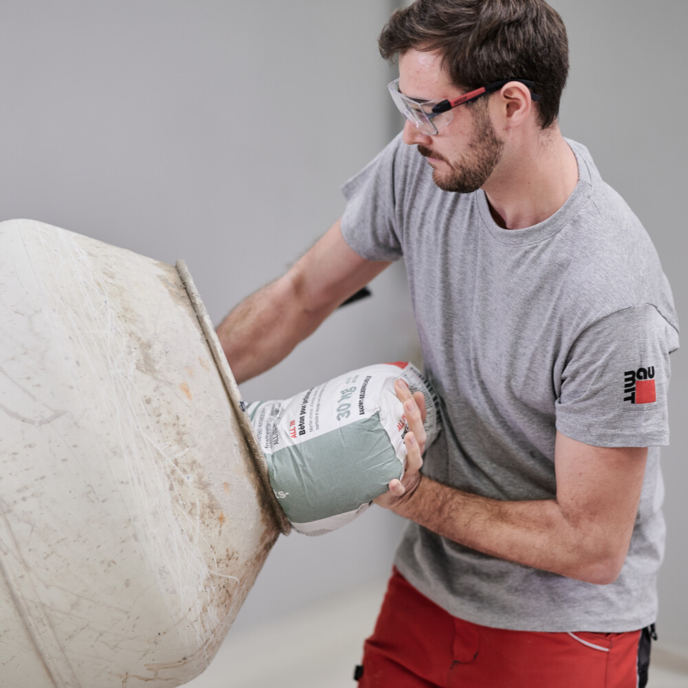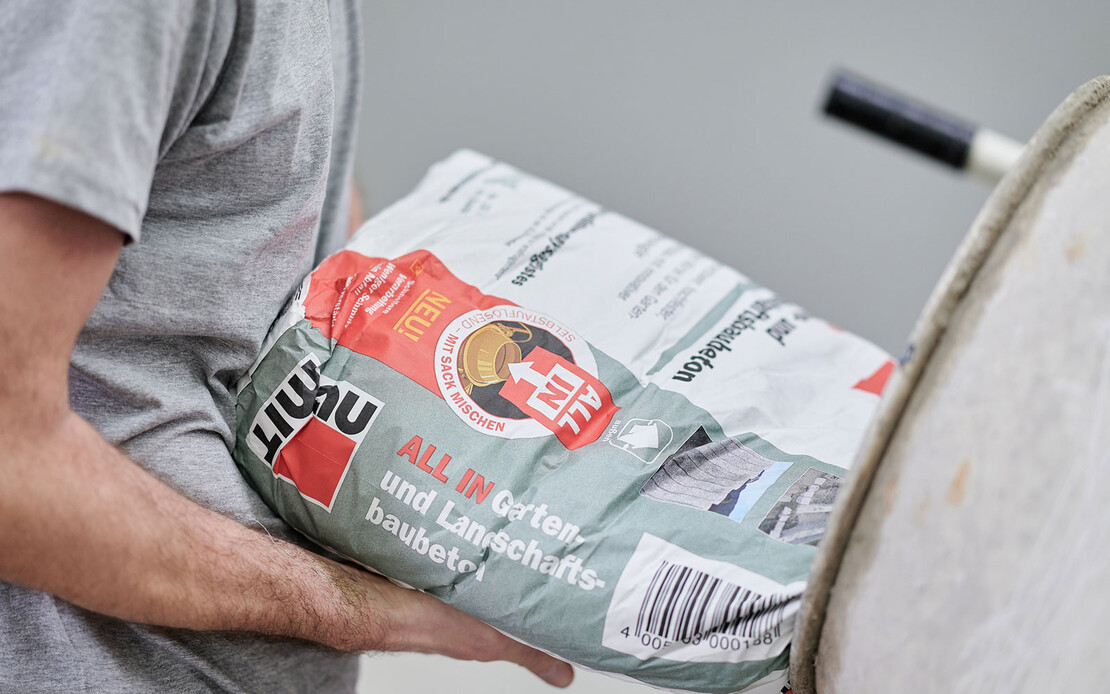Le temps de mélange du béton ALL IN pour jardins et aménagements paysagers est d'environ 4 minutes. Pendant ce temps, le sac en papier se dissout largement, voire complètement, dans le mortier.