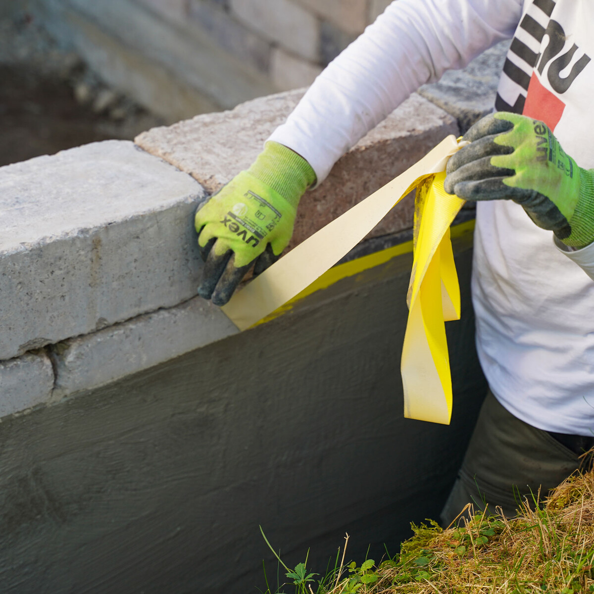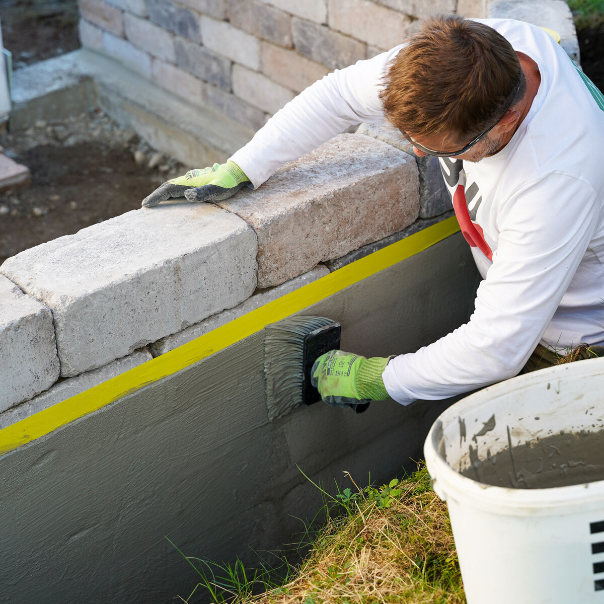 Dans notre exemple, on étanchéifie un mur de jardin qui sera ensuite remblayé avec de la terre.