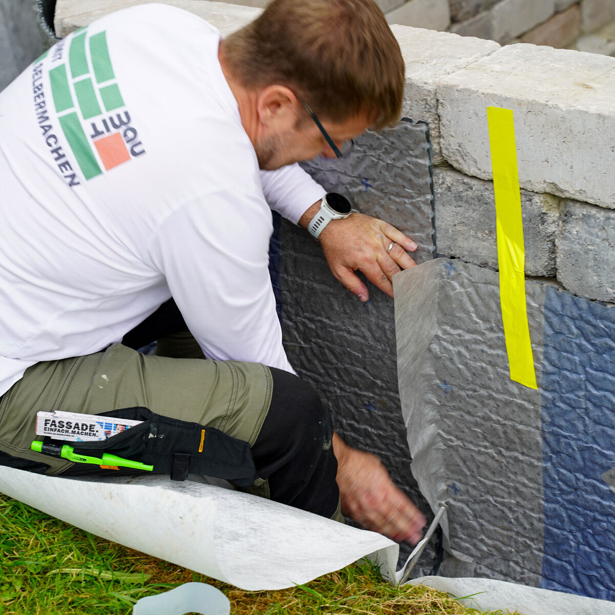 En raison de la diversité des conditions de chantier, les étapes de travail que nous avons présentées ne peuvent pas prendre en compte tous les cas particuliers. Elles montrent l'état actuel de nos expériences au moment de la réalisation des images et sont donc sans engagement. Respecte impérativement les consignes du fabricant de la membrane à excroissances ou de la membrane de drainage utilisée et du profilé.