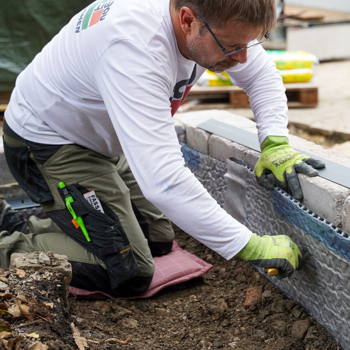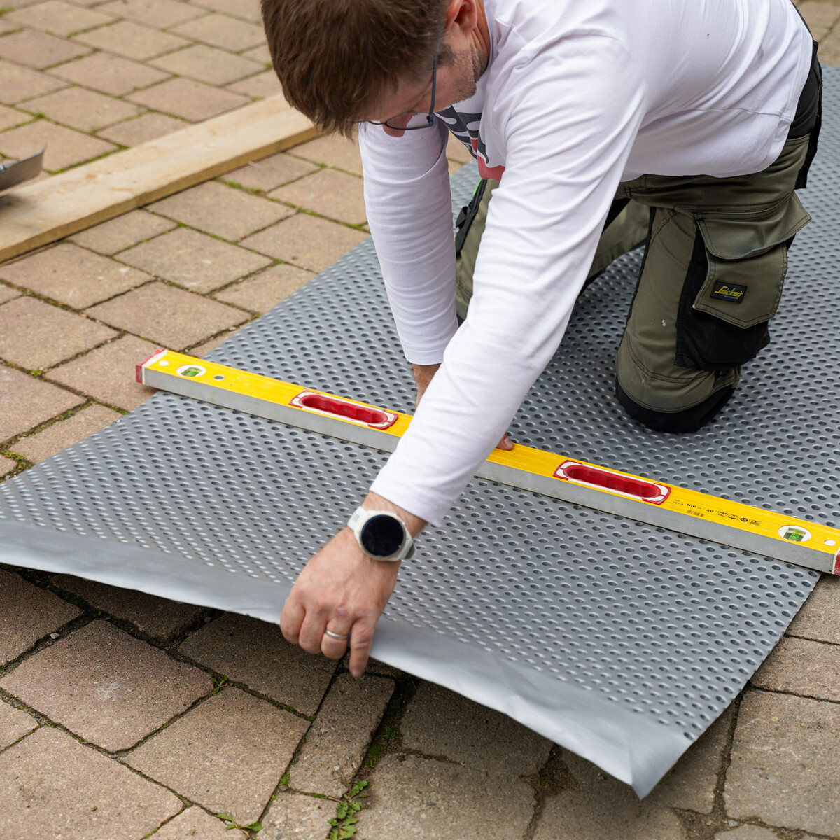 La nappe à excroissances Dörken DELTA-TERRAXX utilisée ici est équipée d'une bande adhésive permettant de relier facilement et sûrement les différentes nappes au niveau des zones de jonction.