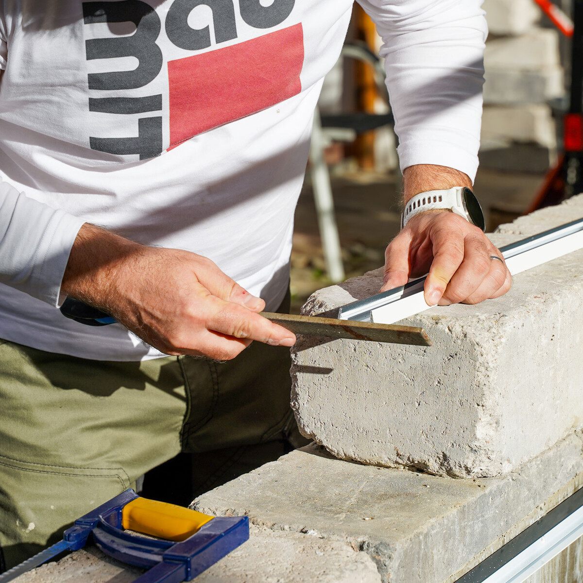 Si possible, commence par installer le profilé de finition pour nappe à excroissances. Pour cela, marque la position du profilé sur la maçonnerie à l'aide d'un marqueur et d'un long niveau à bulle ou d'une règle à niveau.