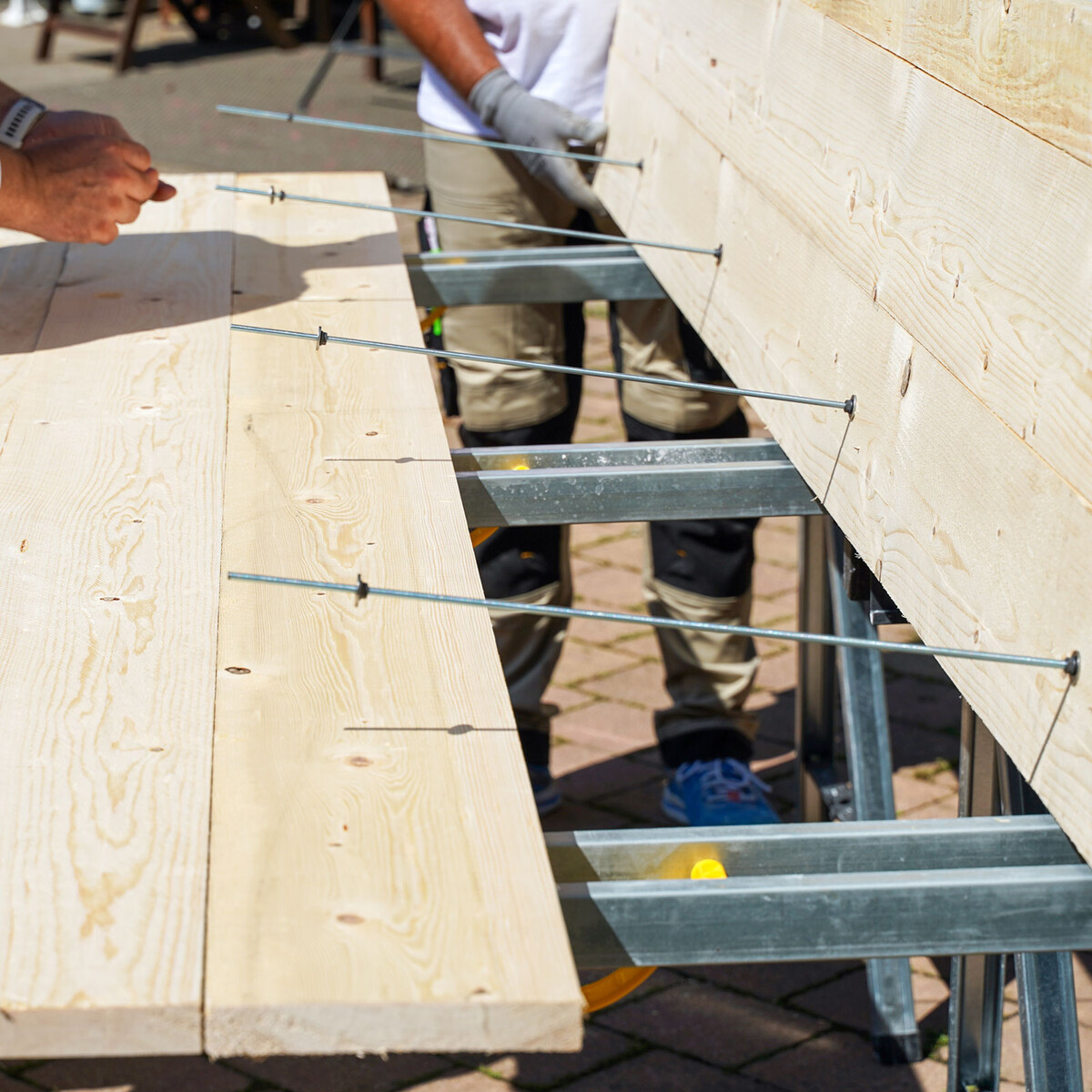 Après avoir vissé les panneaux de coffrage avec les éléments adjacents, fixe les planches par le haut. Cela garantit le maintien de l'ensemble.