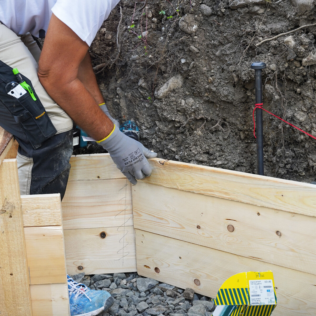 Ensuite, nous plaçons les éléments de coffrage latéraux. Tu peux maintenant utiliser un rapporteur pour aligner exactement le coffrage et mesurer avec précision les longueurs nécessaires.