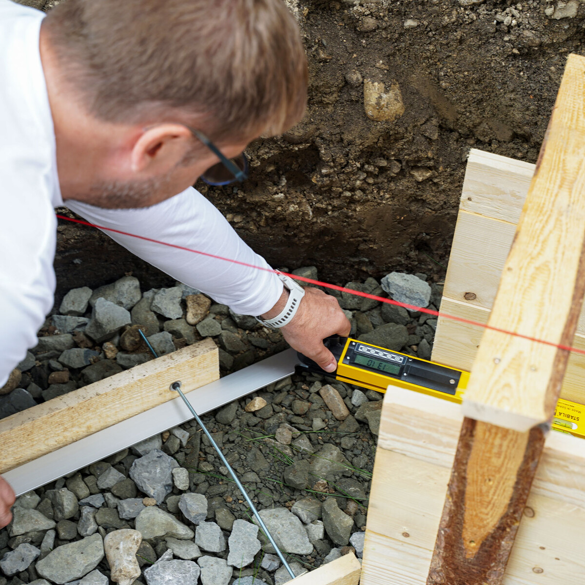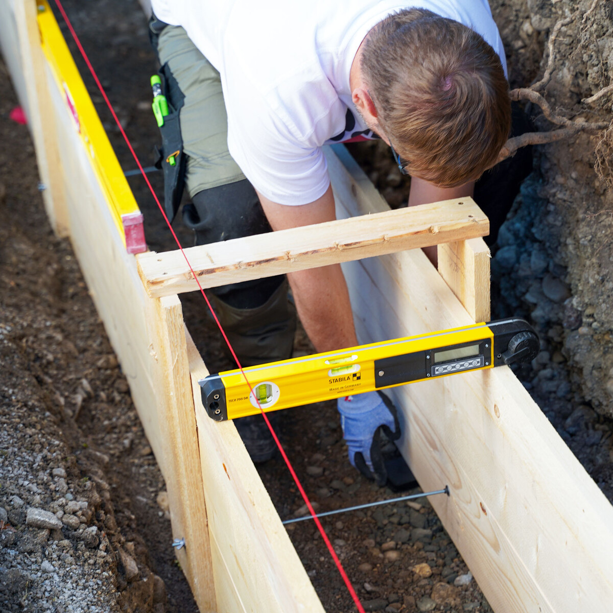 Monter et positionner un coffrage implique du travail et des coûts. Dans notre exemple, nous souhaitons construire un mur de jardin sur cette fondation. Ce mur fera environ 20 mètres de long. Un coffrage bien de niveau permet d'utiliser son bord supérieur comme guide pour tirer le béton, ce qui représente, selon nous, un avantage considérable pour l’étape suivante de la pose du mur. Sur notre chantier, nous avions une différence de hauteur de seulement 5 mm sur l’ensemble des 20 mètres.