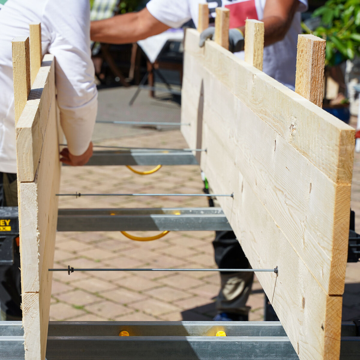 Pour faciliter la manipulation, nous scions les planches de coffrage à une longueur maximale de 2,5 mètres.