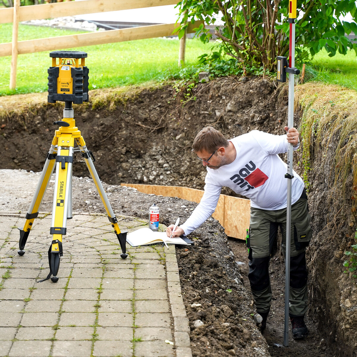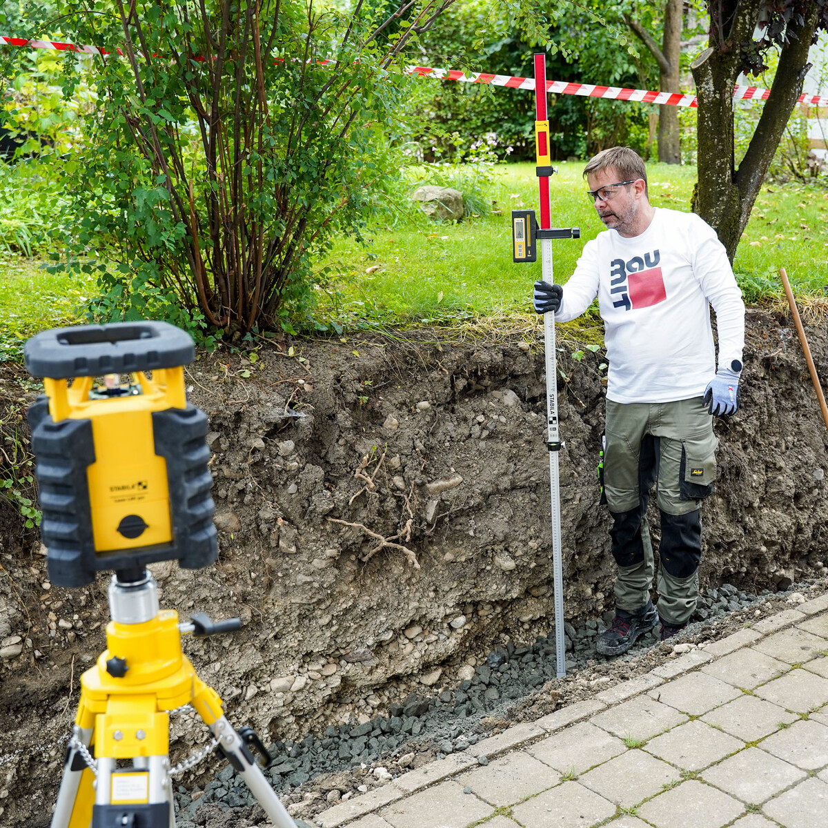 Une fois les travaux terminés et avant de poser le gravier antigel, tu vérifies si la fouille est plane. Sur notre chantier, nous voulons construire un mur de jardin d'environ 20 m de long. Pour cette longueur, le plus simple est de vérifier la planéité à l'aide d'un laser rotatif.