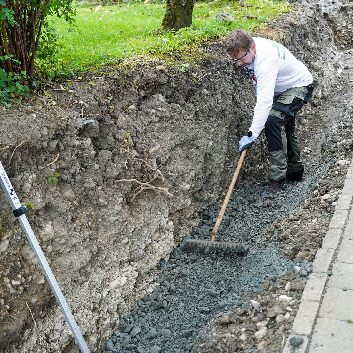 Nous recommandons de vérifier la profondeur de la fouille à des intervalles de 1 à 1,5 m. Marque les points de mesure avec un spray de marquage.