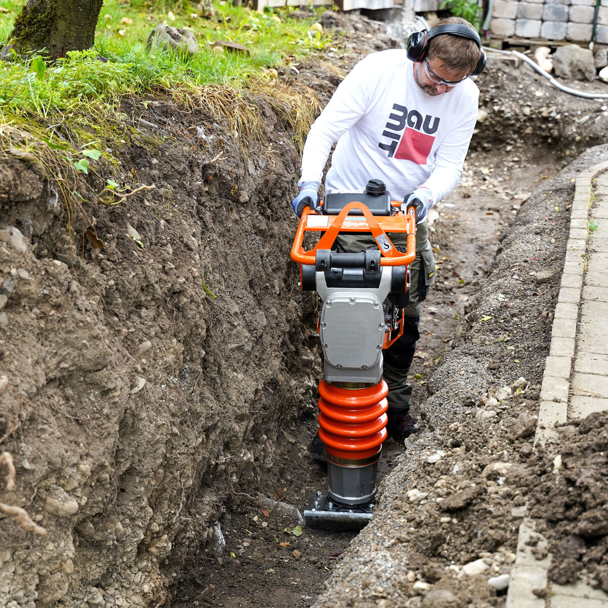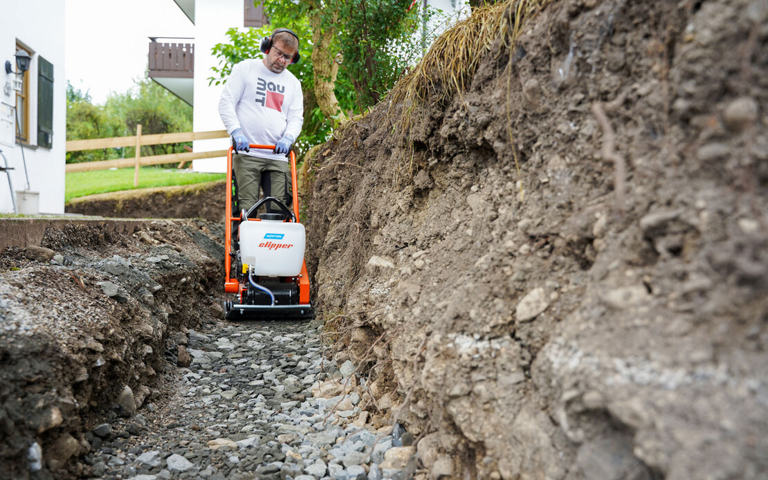 Après avoir rectifié la fouille, tu peux compacter le sol. Pour ce faire, utilise une plaque vibrante ou une pilonneuse vibrante. La pilonneuse vibrante de Norten Clipper que nous utilisons offre, grâce à la surface d'appui plus petite de la plaque de base, une capacité de compactage plus élevée par rapport à une plaque vibrante habituelle.