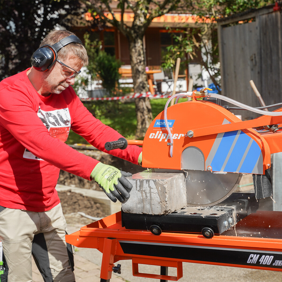 Heimwerker sägt Natursteine und schneidet Betonsteine im Garten mit der Norton Clipper Steinsäge, um eine Gartenmauer zu bauen. Er trägt Gehörschutz, Schutzbrille und Arbeitshandschuhe.