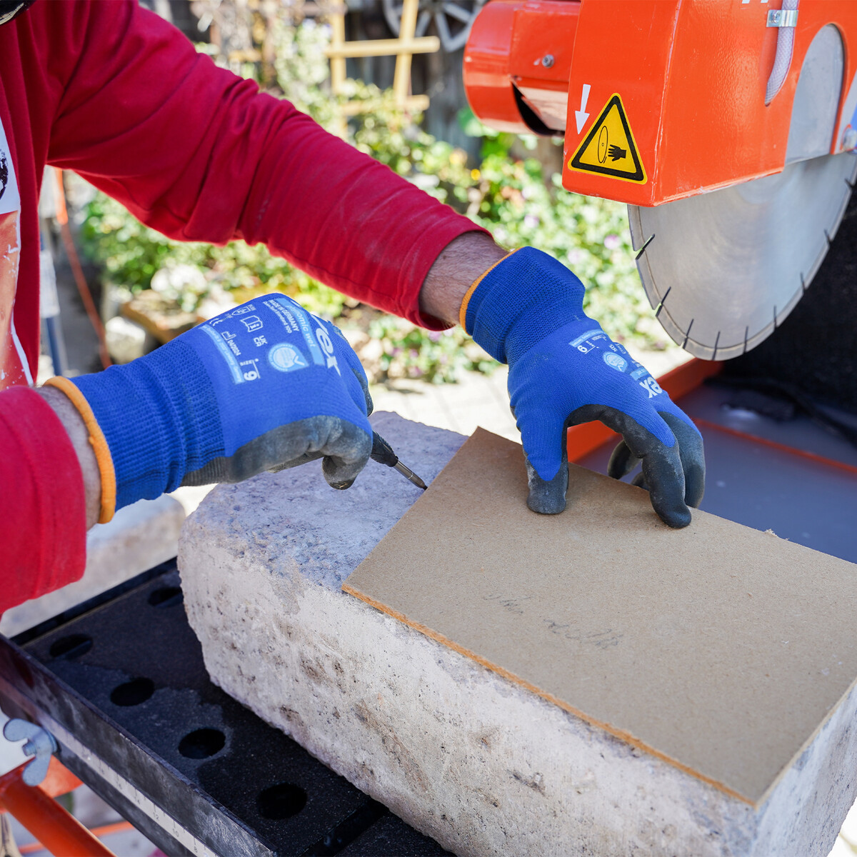 Le gant de travail KinetiXx X-blue est agréablement serré et ferme bien le poignet - le mortier reste donc bien à l'extérieur et ne peut pas non plus pénétrer dans le gant par inadvertance...
