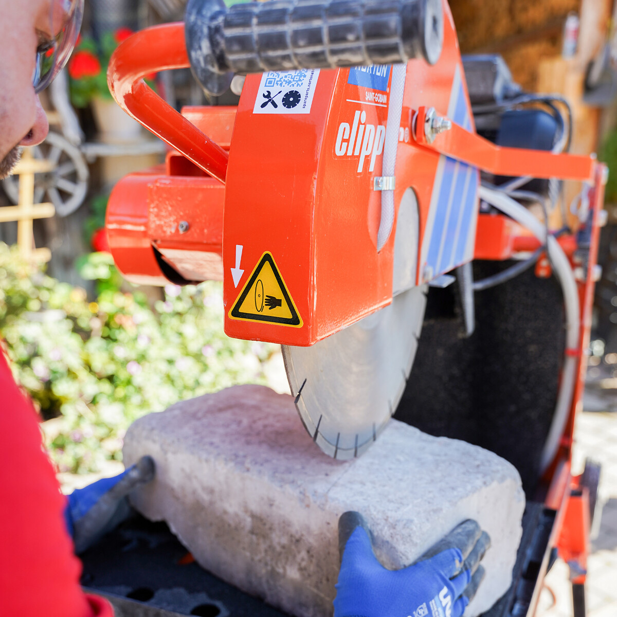 Lors du choix de la scie, tiens compte de la profondeur de coupe nécessaire. Dans cet exemple, nous travaillons sur des  pierres en béton d'une épaisseur de 14 cm. Nous optons donc pour la scie sur table Norton Clipper CM 400.
