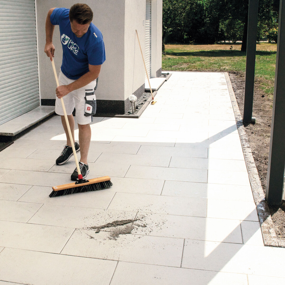 Balaye soigneusement le matériau superflu avec un balai de rue, en diagonale par rapport au tracé du joint. Une fois que le matériau a pris et durci, il est très difficile de l'enlever mécaniquement.