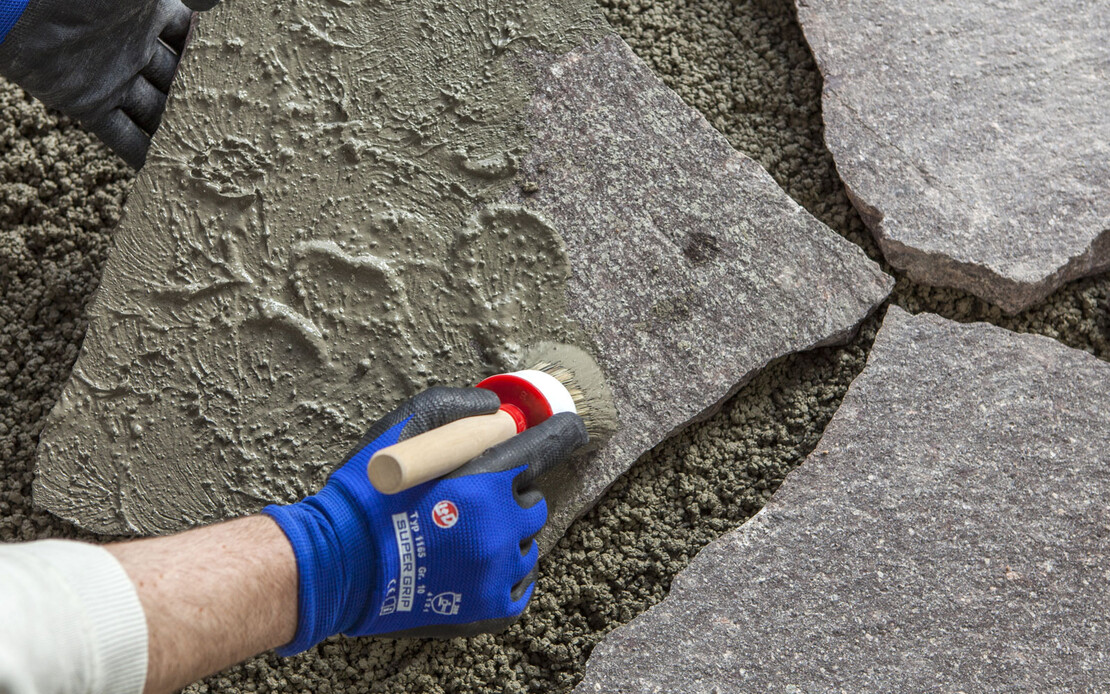 Avant de poser les dalles en pierre naturelle, appliquer le coulis de ciment Baumit comme agent d'adhérence sur le Mortier de drainage de pavages frais. Ensuite, les dalles sont posées immédiatement.