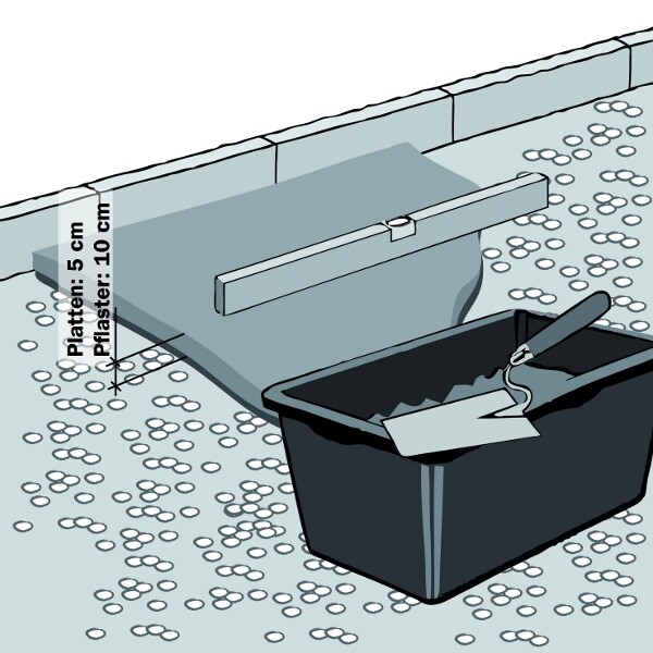 Mélanger le Mortier de drainage de pavages à consistance de terre humide selon les indications figurant au dos du sac et l'appliquer à plat, en pente, sur une épaisseur d'environ 5 cm pour les dalles et 10 cm pour les pavés.