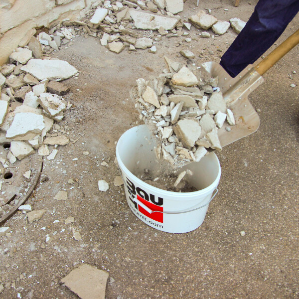 Les gravats doivent être enlevés le plus rapidement possible. Tu éviteras ainsi que, par temps humide, les sels présents dans le vieux crépi décollé ne se dissolvent et ne soient à nouveau transportés dans la maçonnerie par le sol.