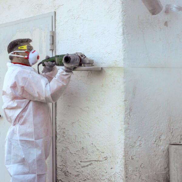 Pour obtenir un bord droit entre la zone à rénover et l'ancien crépi, tu sépares les deux zones par une coupe avec un flex. Veille à te protéger personnellement en portant des lunettes de protection, un masque respiratoire, des gants et des vêtements protégeant de la poussière.