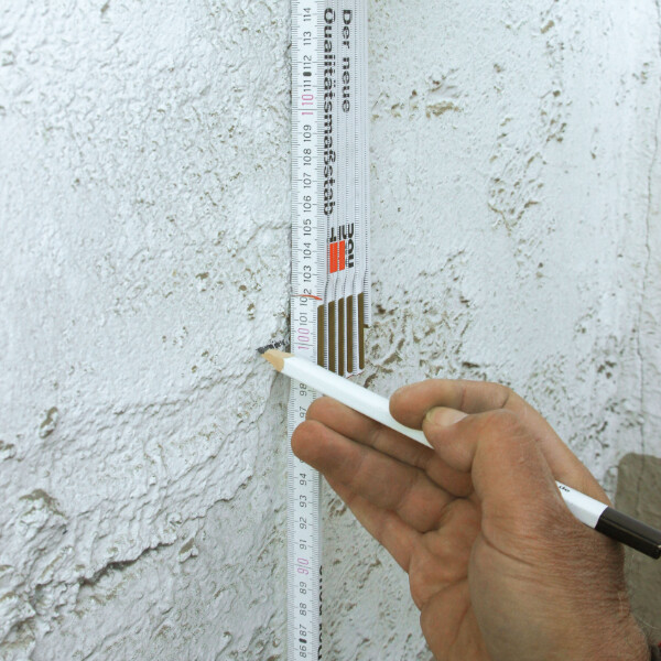 L'ancien crépi doit être enlevé jusqu'à 1 mètre au-dessus de la limite des dégâts. Mesure donc à partir de la limite supérieure du dommage, qui se manifeste par des efflorescences de sel, des écailles d'enduit et de peinture, et marque cette zone.
