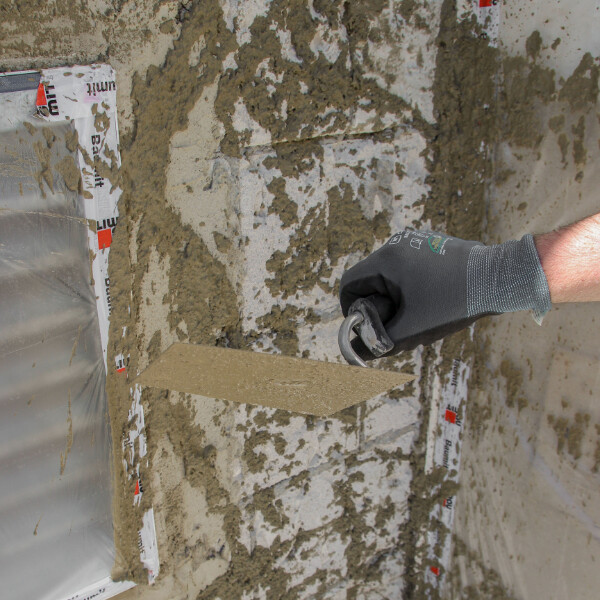 Mélangez le mortier d'assainissement selon les instructions du fabricant et projettez-le sur la maçonnerie, par exemple avec une truelle. La projection forme une surface grossière, semblable à des nodules, et offre à l'enduit suivant une bonne base pour une adhérence optimale. Il doit recouvrir la surface à environ 50 % .
