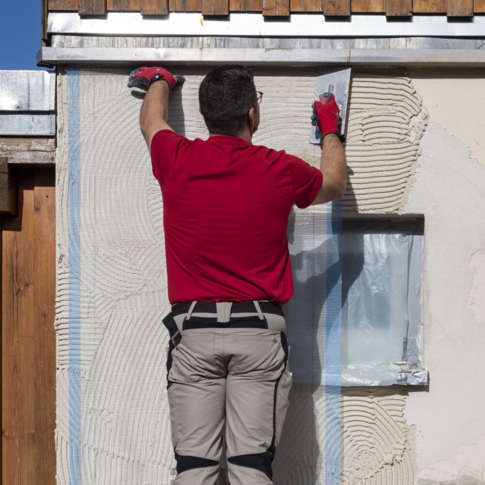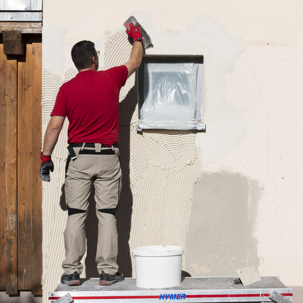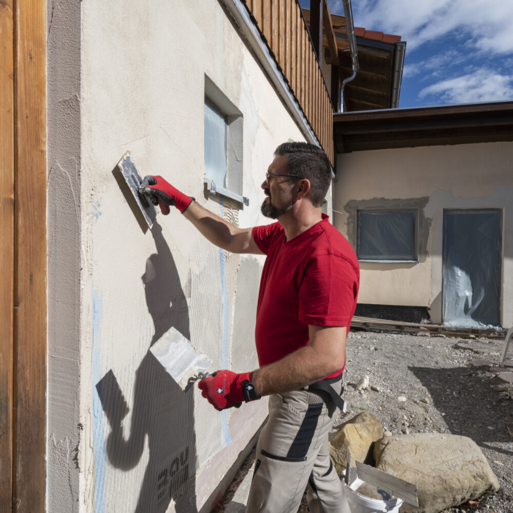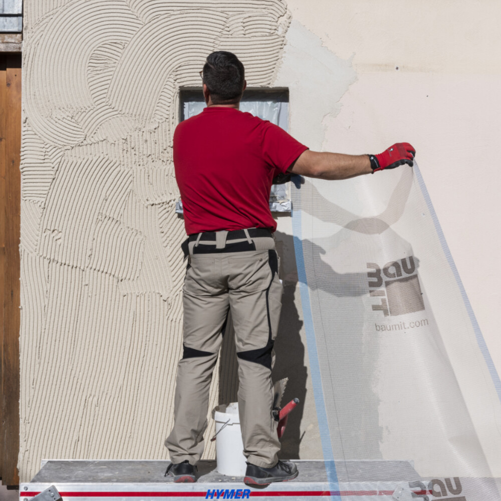 Avec le côté denté de la truelle dentée, tu enfonces la Toile d'armature dans l'enduit de façade et d'assainissement frais, sur toute la surface et sans faire de plis.