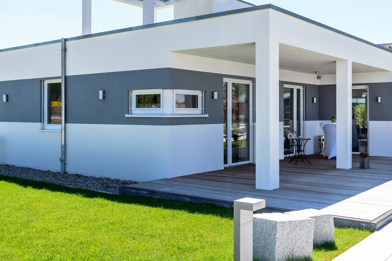 - Pour la réalisation de surfaces d’enduit décoratives blanches ou colorées à l’extérieur.