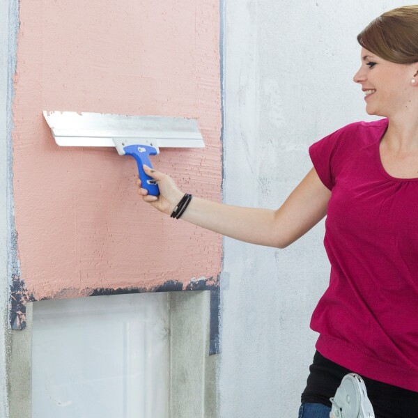 Mélange l'enduit avant de l'appliquer, puis applique-le à l'aide d'une truelle inoxydable (sur le Support préparé) en respectant l'épaisseur du grain. Pour les grandes surfaces continues, divise le mur/la façade en parties d'environ 1 à 1,5 m². Travaille de haut en bas afin d'éviter de "salir" la surface d'enduit finie par la chute de matériaux pendant l'application ou la structuration. Une surface continue doit être entièrement enduite sans pause afin d'éviter les raccords inesthétiques. Nous recommandons donc de faire appel à deux personnes pour réaliser une grande surface d'enduit.