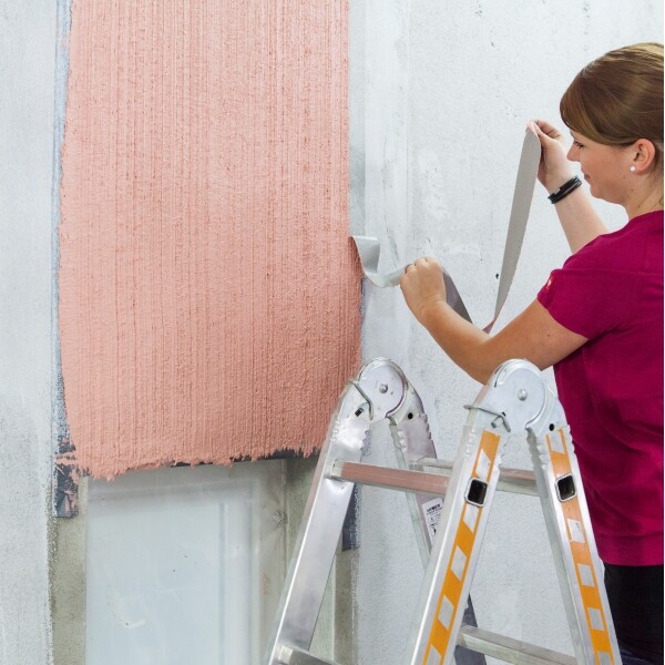 Les travaux ne peuventêtre effectués qu'à des températures supérieures à +5°C (température ambiante et température de l'élément de construction) et si possible pas à plus de +30 °C. Les enduits décoratifs minéraux sont des produits contenant du ciment et sont donc alcalins. Protégez-vous avec des vêtements de travail appropriés (gants, lunettes, etc.). Veillez à votre propre sécurité lorsque vous travaillez sur la façade. Utilisez des aides à la montée appropriées telles que des échelles ou des échafaudages de travail.
