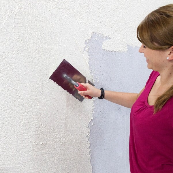 Lors de la structuration, il reste toujours un peu de liant accroché à la planche à râper, retire régulièrement les restes avec la truelle. Elimine le liant excédentaire dans un récipient séparé (ne remets en aucun cas les restes dans le seau à mortier ou dans l'enduit prêt à l'emploi). Si tu as l'impression que l'Enduit graisse lors de la structuration et qu'il n'est pas possible de créer une Structure, la cause est généralement un excès de Matériau appliqué. Dans ce cas, tu nivelles à nouveau la surface avec la truelle en exerçant une certaine pression et tu poursuis ensuite la structuration.