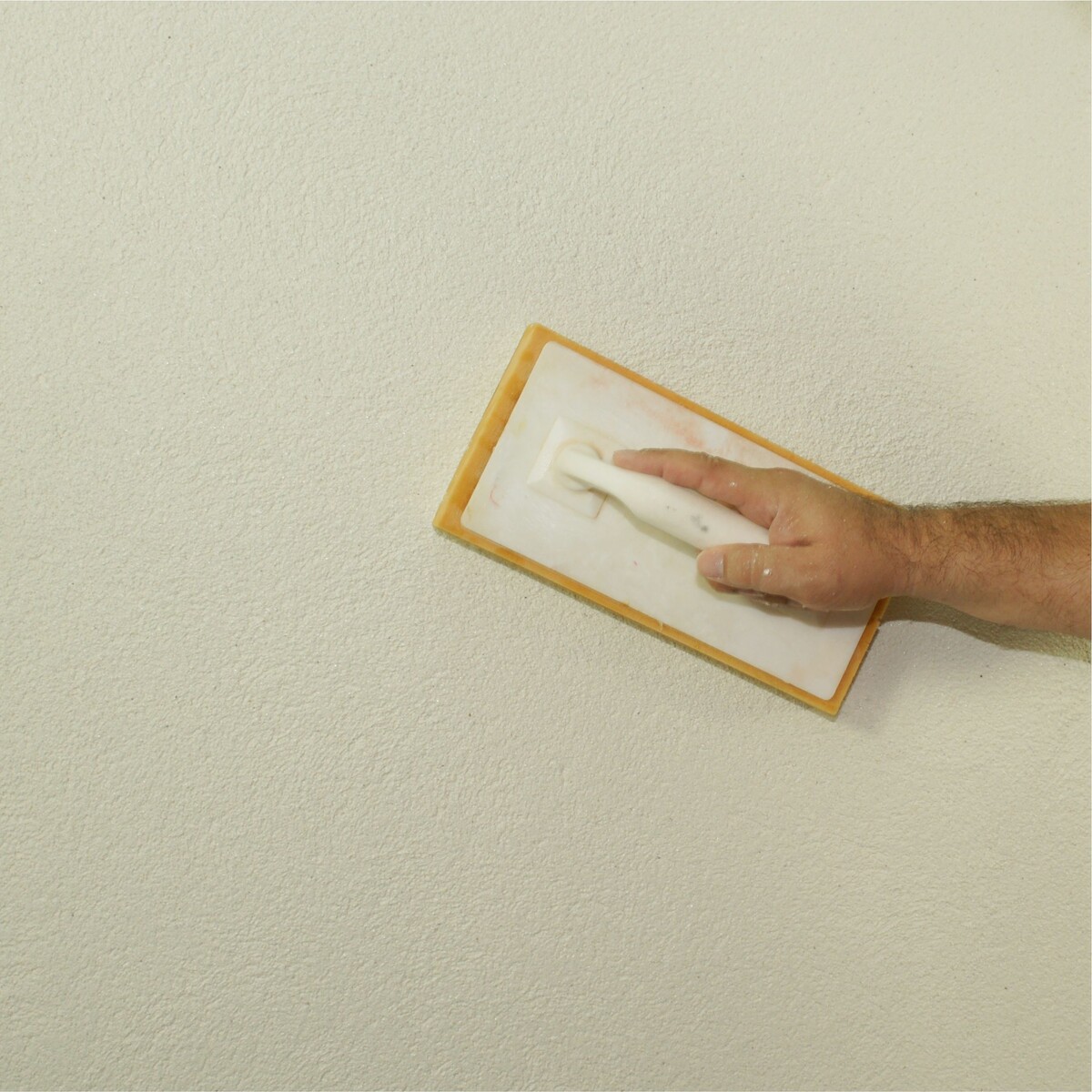 Juste après l'application de l'Enduit, tu peux le structurer en effectuant des mouvements circulaires avec une planche à râper en plastique. Si tu as l'impression que l'Enduit graisse sur le Support, c'est qu'il y a trop de Matériau sur le Support. Pour enlever l'excédent de Matériau, passe à nouveau la truelle sur la surface avec une pression légère à moyenne. Tu peux remettre l'excédent de matériau dans le Matériau mélangé. Lorsque tu frottes avec la planche à râper en plastique, il reste toujours un peu de Matériau sur la planche à râper. Après avoir frotté, retire ce résidu et jette-le dans une poubelle à disposition.