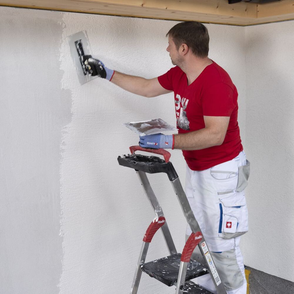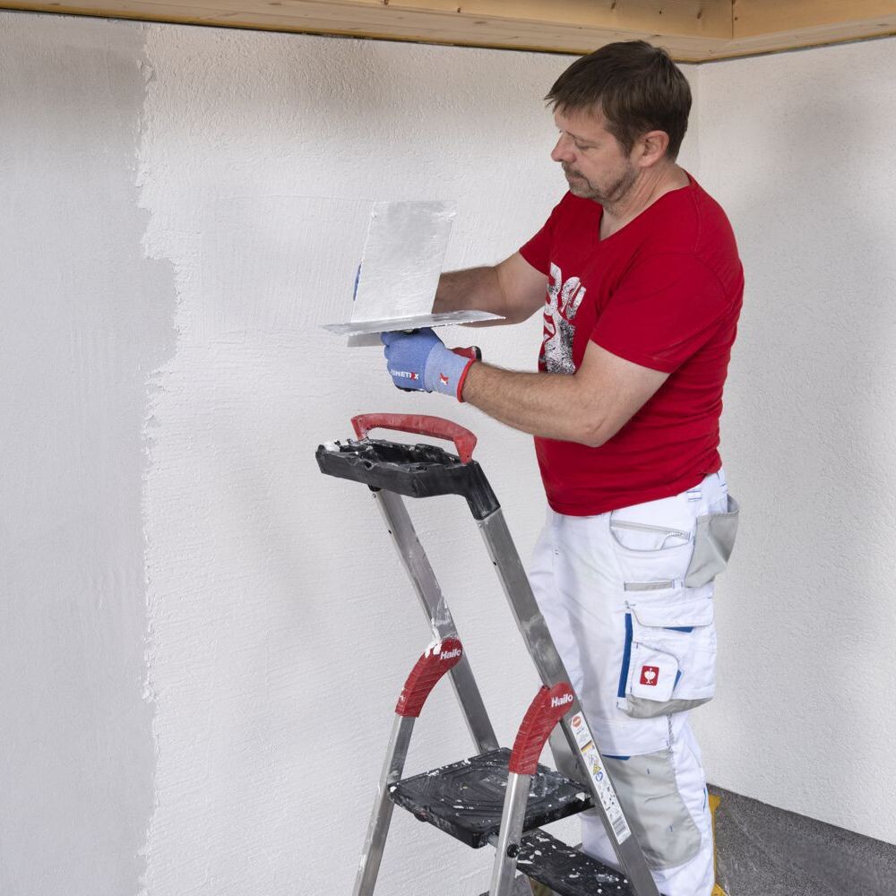 Tu peux facilement enduire les surfaces à traiter jusqu'à une hauteur d'environ 2,5 m depuis une échelle, mais il est préférable de le faire sur un petit échafaudage. Pour des surfaces de façade plus importantes, par exemple sur plusieurs niveaux d'échafaudage, tu as clairement besoin de plusieurs ouvriers et d'un échafaudage de travail sûr.