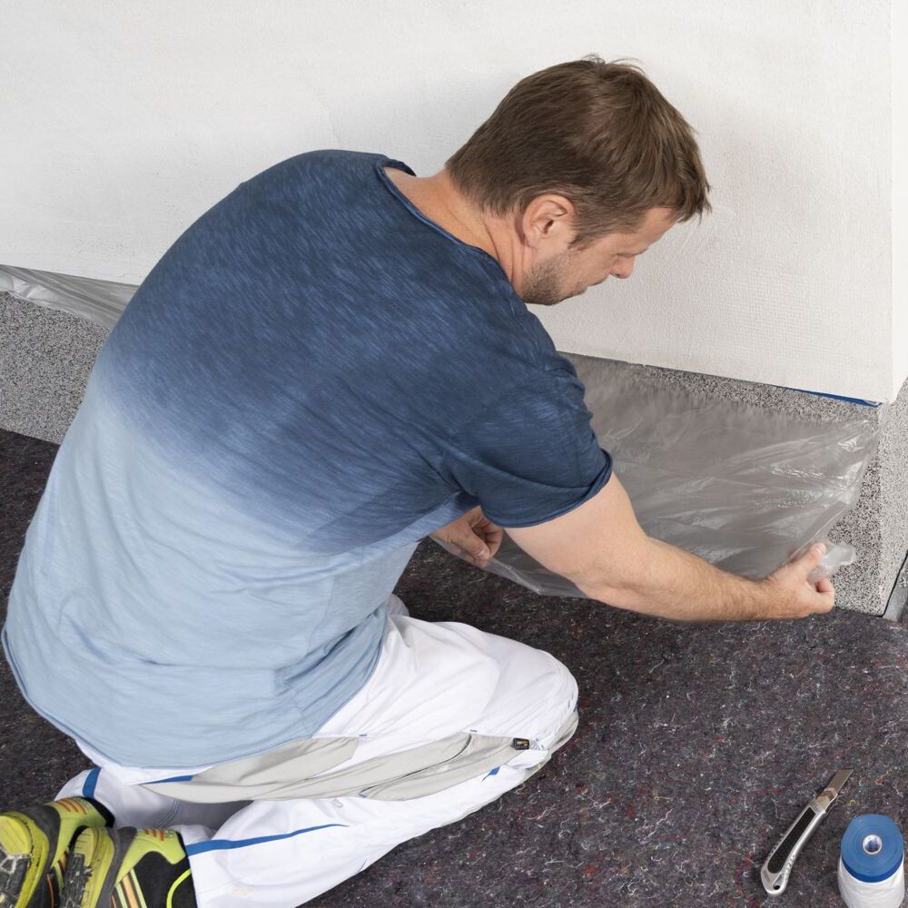 Avant de commencer la mise en œuvre de l'enduit de structure, protège les surfaces ou les éléments de construction adjacents et non destinés à être recouverts contre les salissures. Colle et recouvre les surfaces concernées