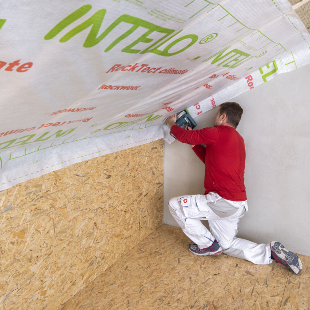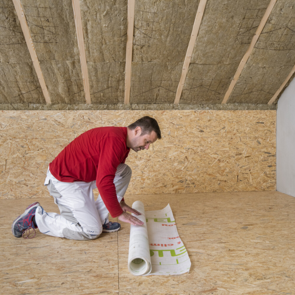 Lors de la détermination des points de fixation, veille à ce que le freine-vapeur soit collé sur le chevron / l'entrait de toit avec un chevauchement d'au moins 10 cm. En même temps, il faut un peu de tampon pour la transition entre la pente du toit et les combles afin de compenser les éventuels mouvements de la construction.