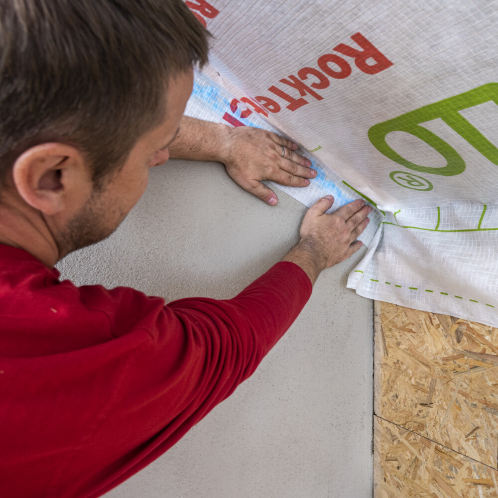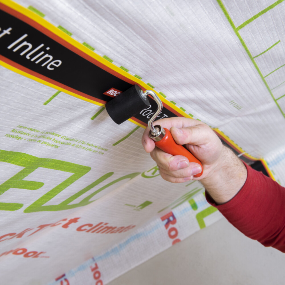 Enfin, tu presses fermement le ruban adhésif sur le pare-vapeur à l'aide d'un petit rouleau en caoutchouc. Les rouleaux en caoutchouc mousse ou les rouleaux de couture utilisés dans le domaine de la peinture ne sont pas adaptés à cet effet.