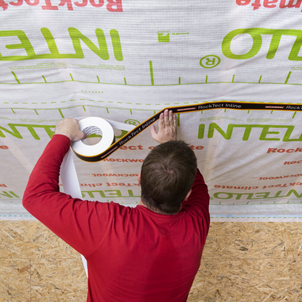 Colle ensuite la bande adhésive au milieu de la zone de jonction des deux lés de freine-vapeur.