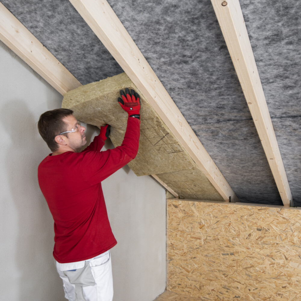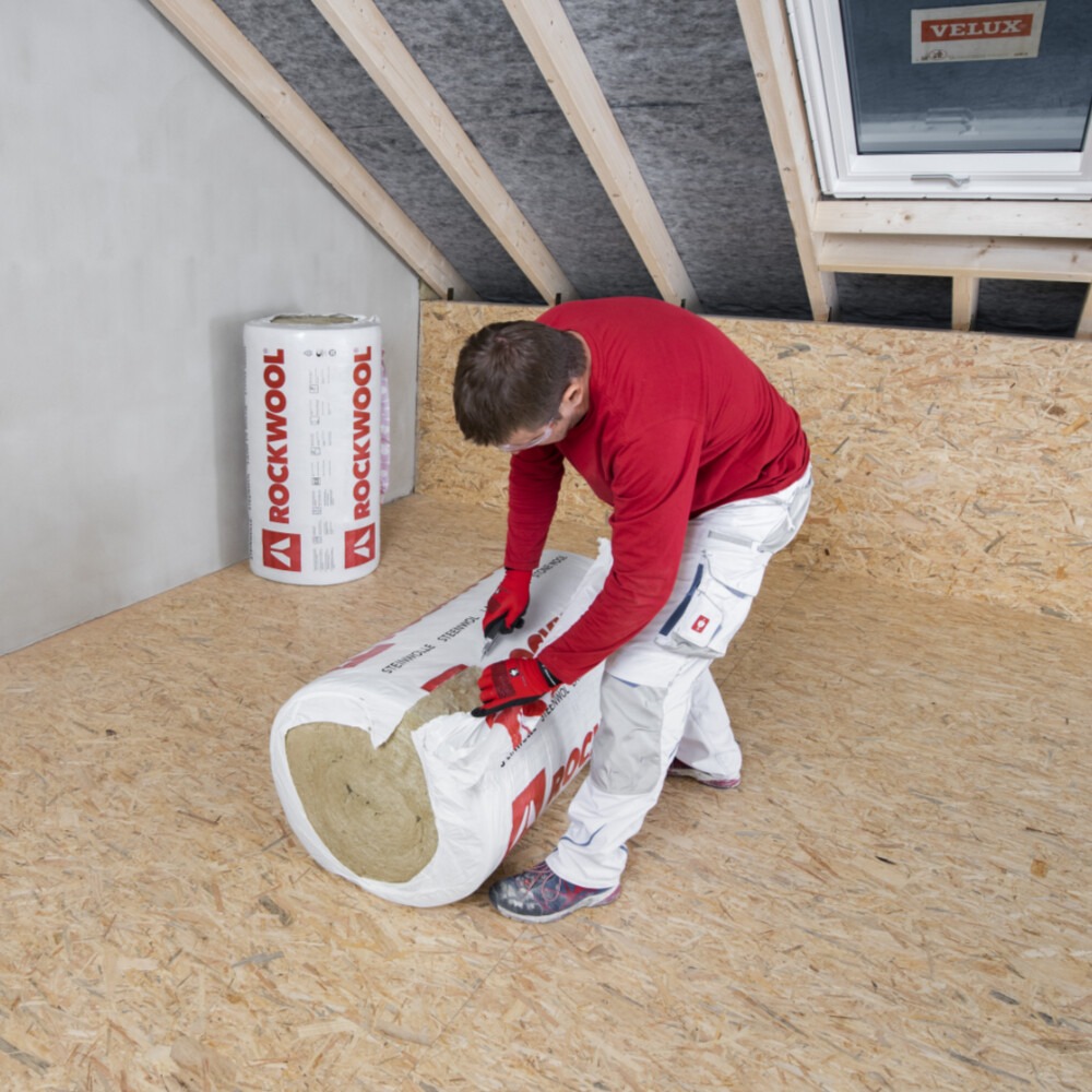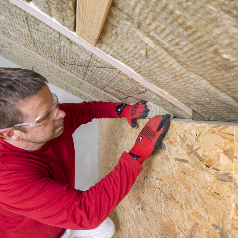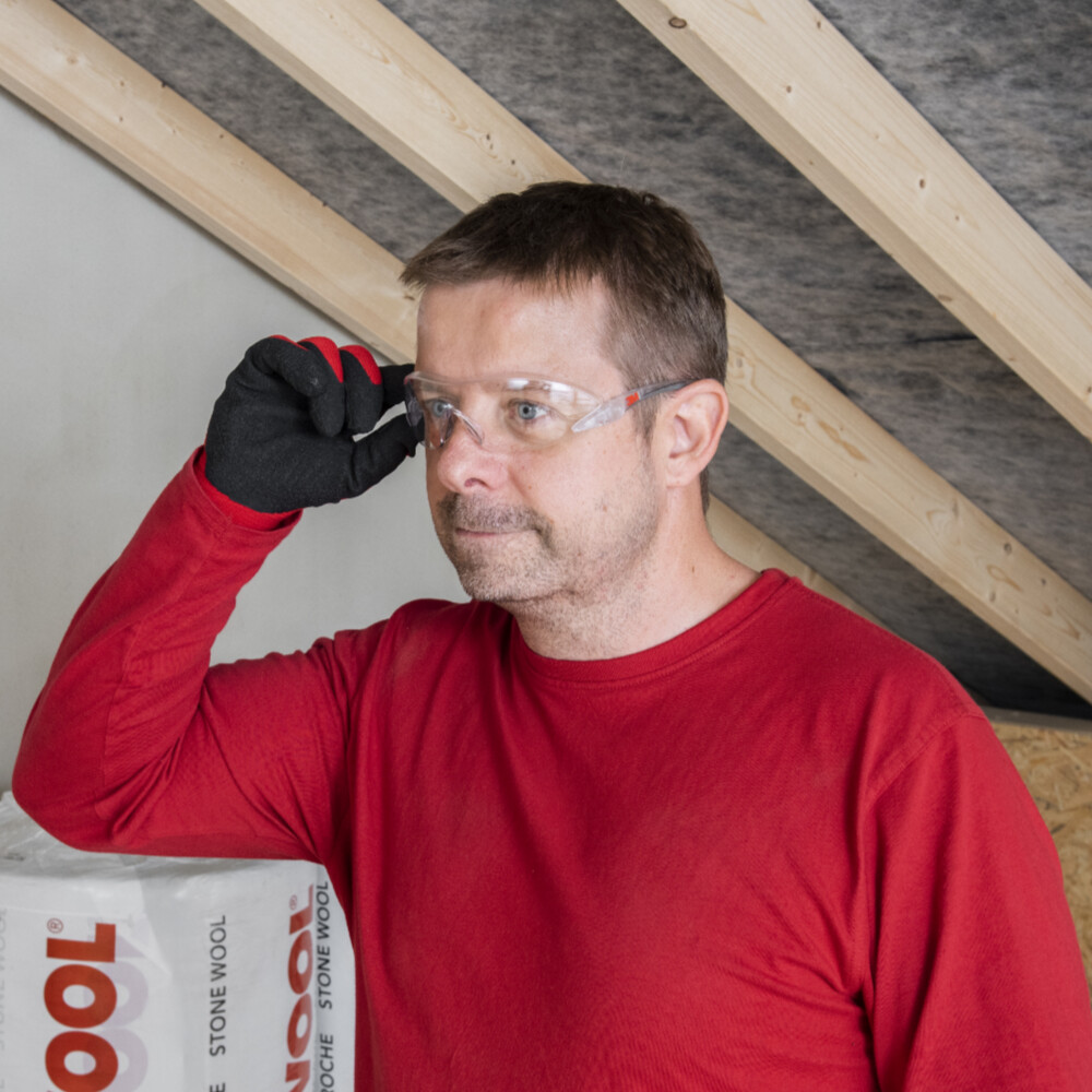 Lors de travaux d'isolation pour l'isolation de toitures avec de la laine de roche ou de la laine minérale, il est judicieux de porter des vêtements de travail à manches longues, des pantalons longs et d'utiliser des gants de travail.